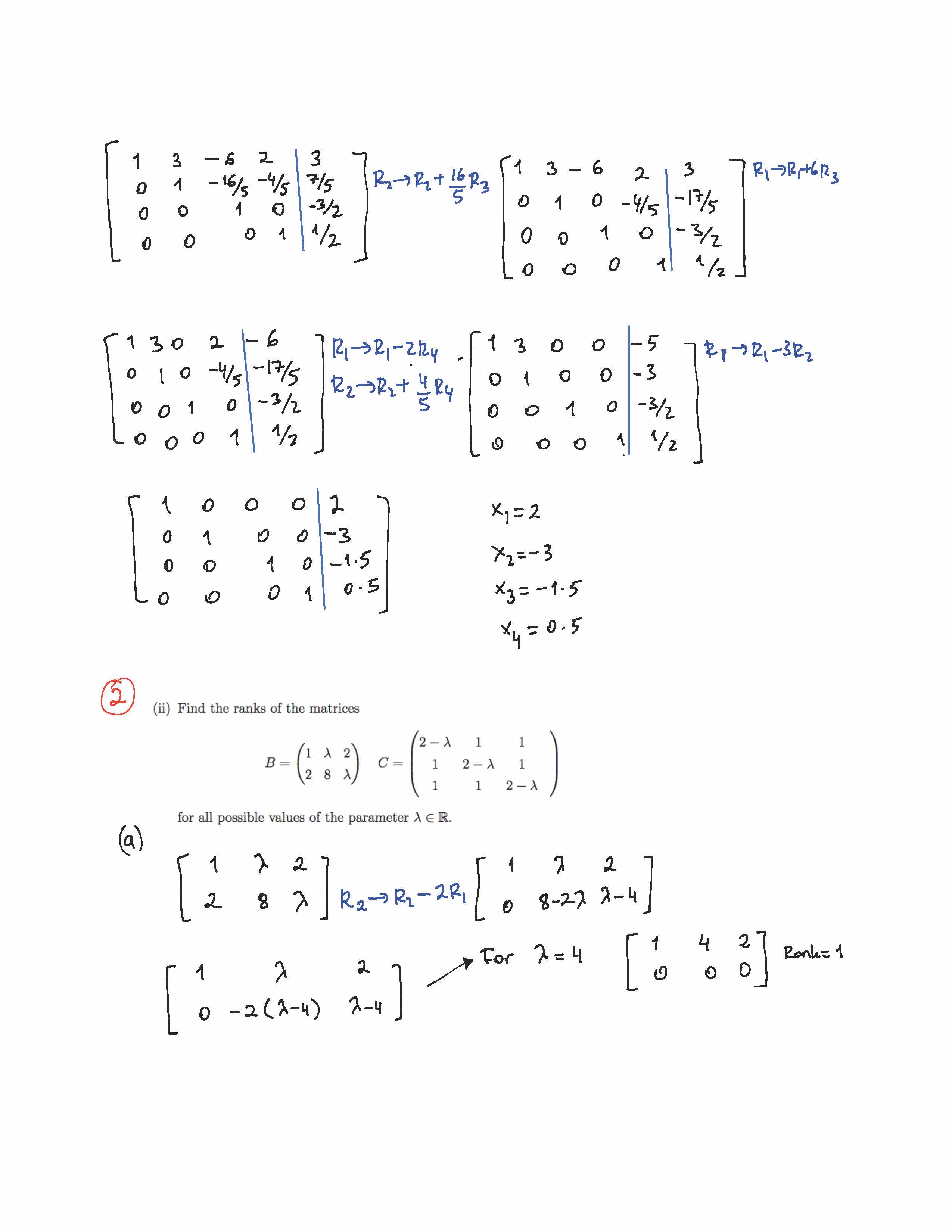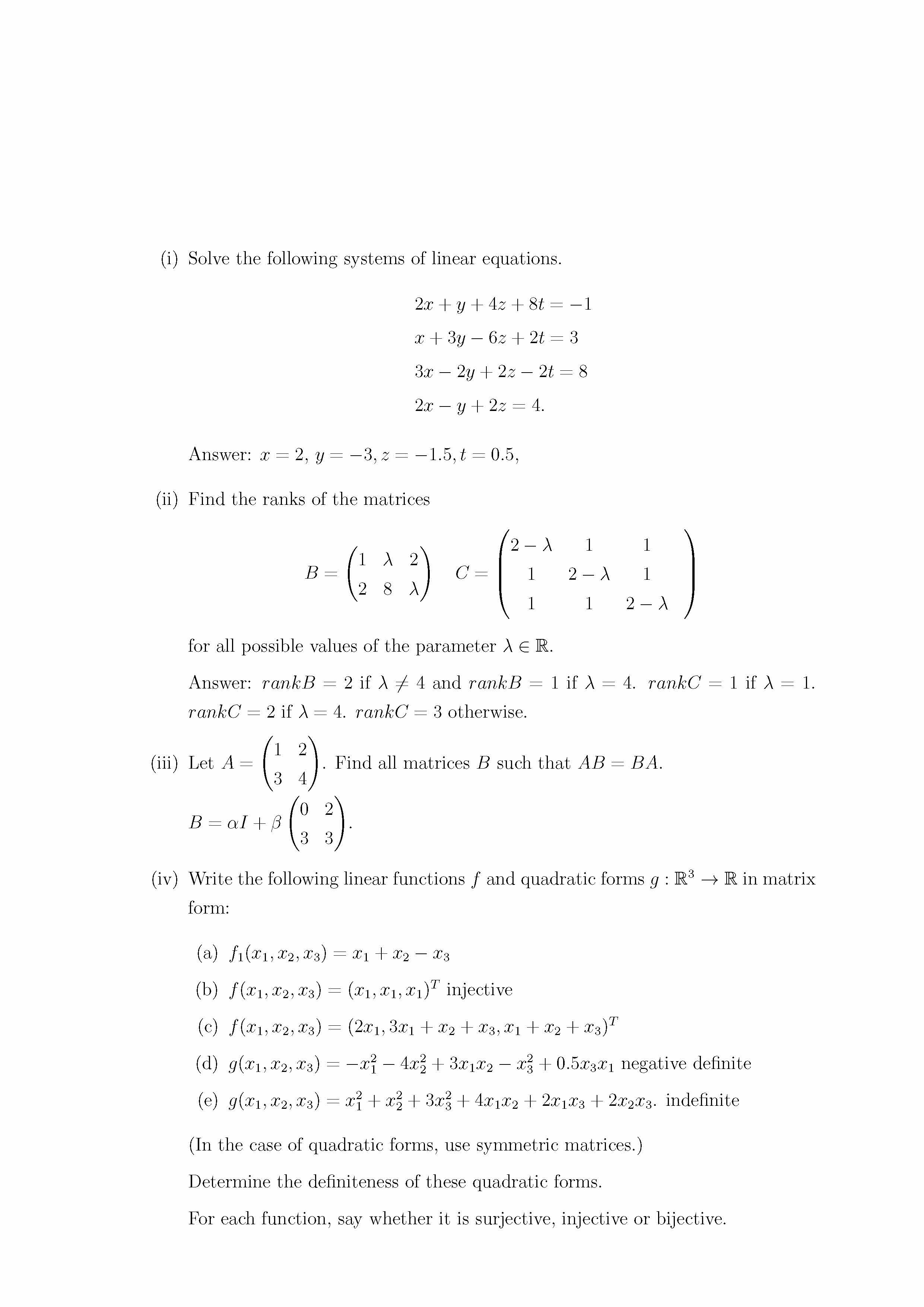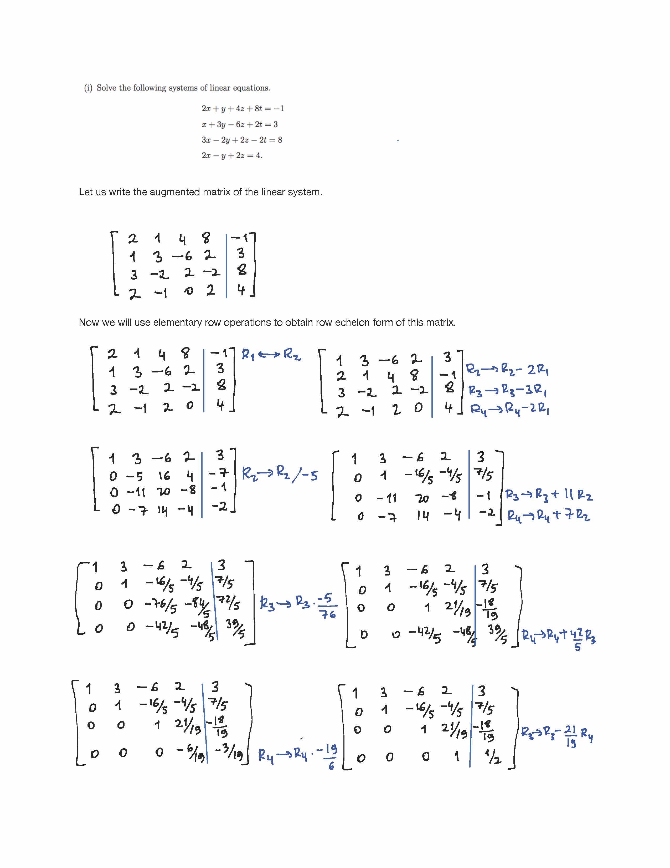 (i) Solve the following systems of linear equations. 2x+y+4z+8t=-1...