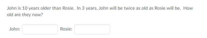 John is 10 years older than Rosie. In 3 years, John will be twice a...