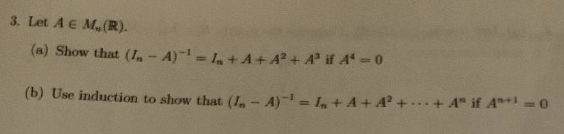 3. Let Ae Mn(R). (a) Show that - = In+A+A2+ A³ if A4 = 0 (b) U...