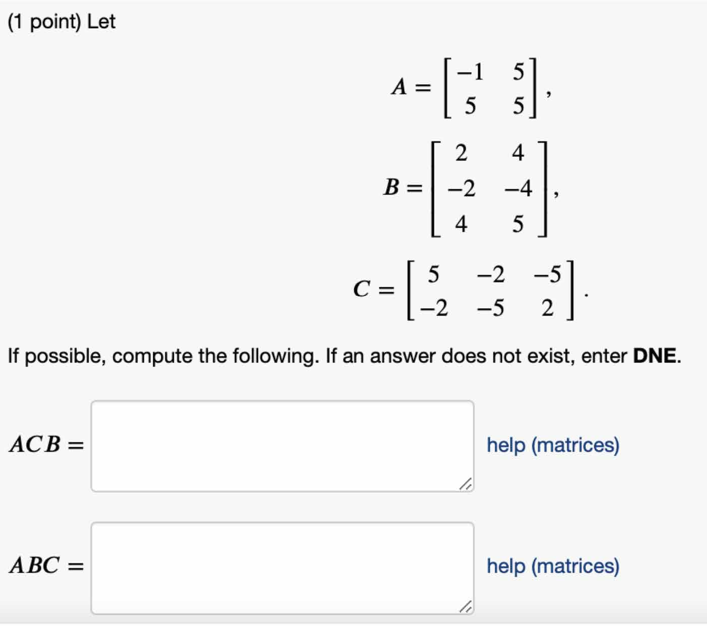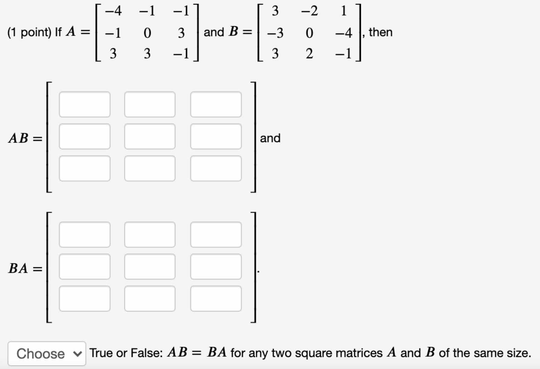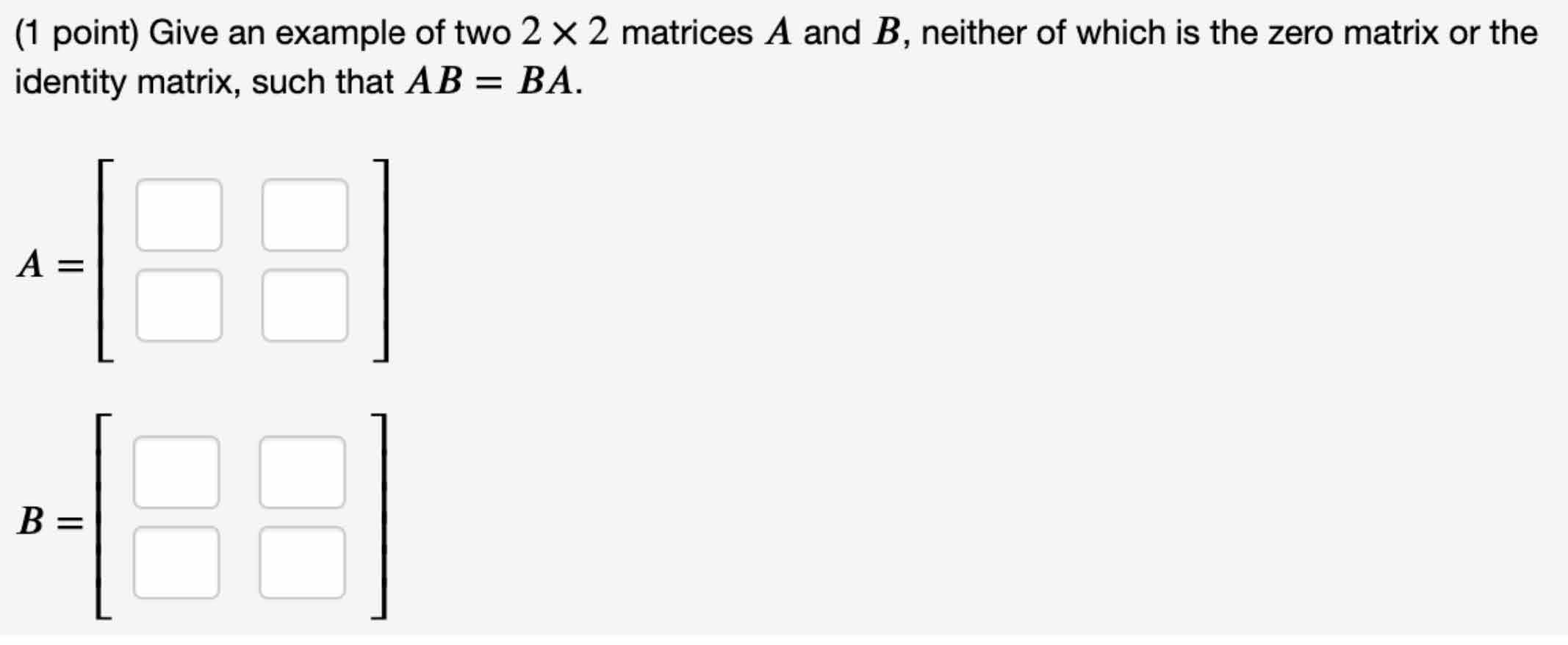 (1 point) Give an example of two 2x 2 matrices A and B, neither of ...