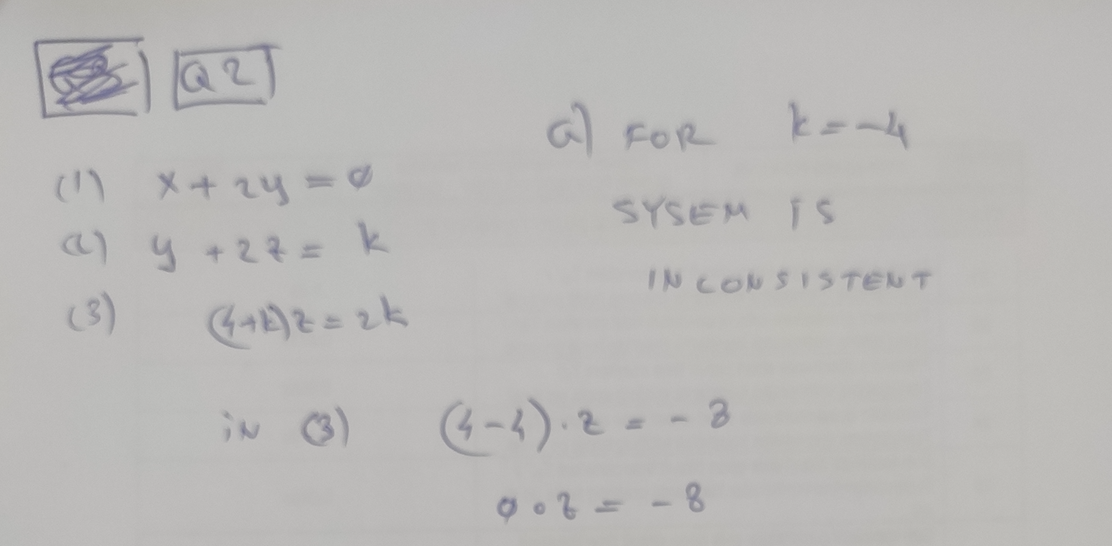 PROBLEM #2 (4 marks) Consider the linear system x+2y=0 y+2z= k...
