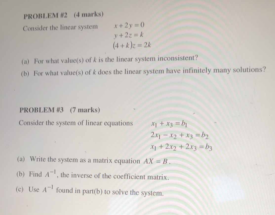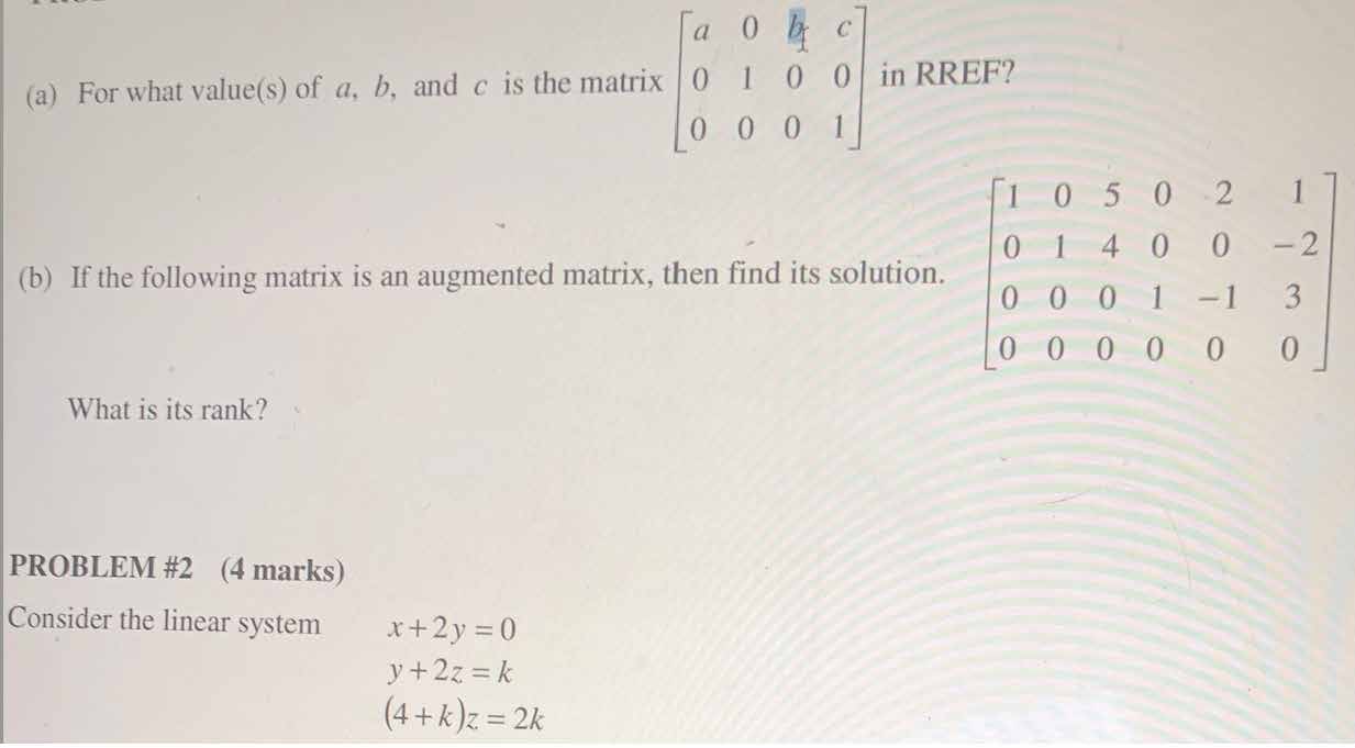 PROBLEM #2 (4 marks) Consider the linear system x+2y=0 y+2z= k ...