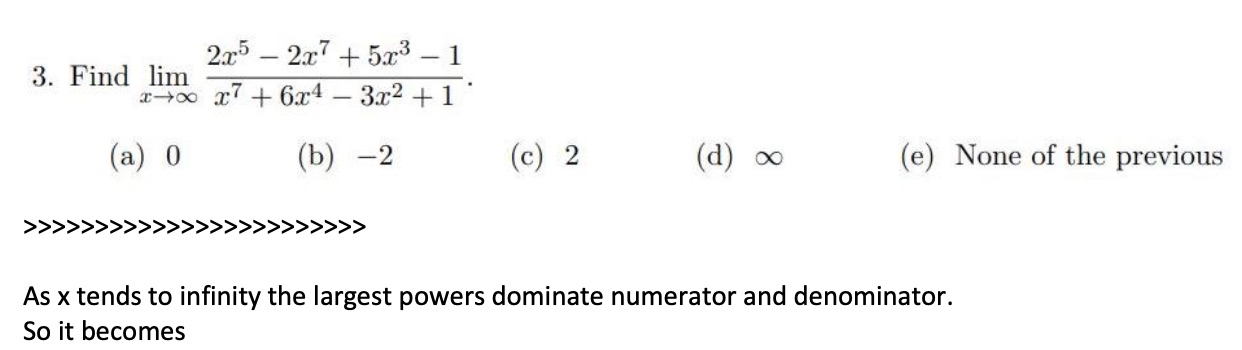 3. Find I->00 lim x7 + 6.4 - 3x2+1 . (a) 0 (b)-2 (c) 2 (d)...