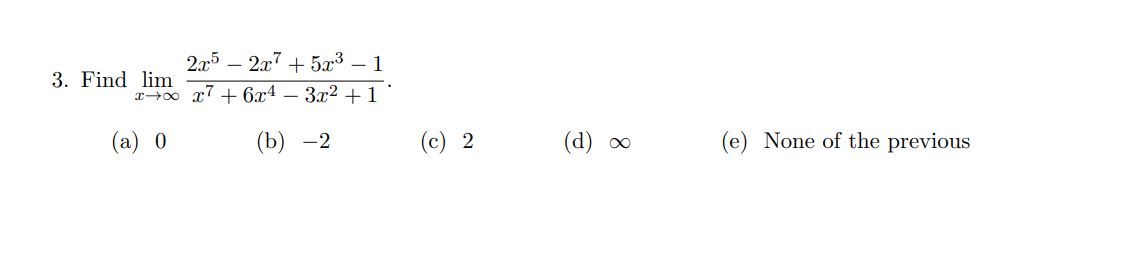 3. Find I->00 lim x7 + 6.4 - 3x2+1 . (a) 0 (b)-2 (c) 2 (d) ...