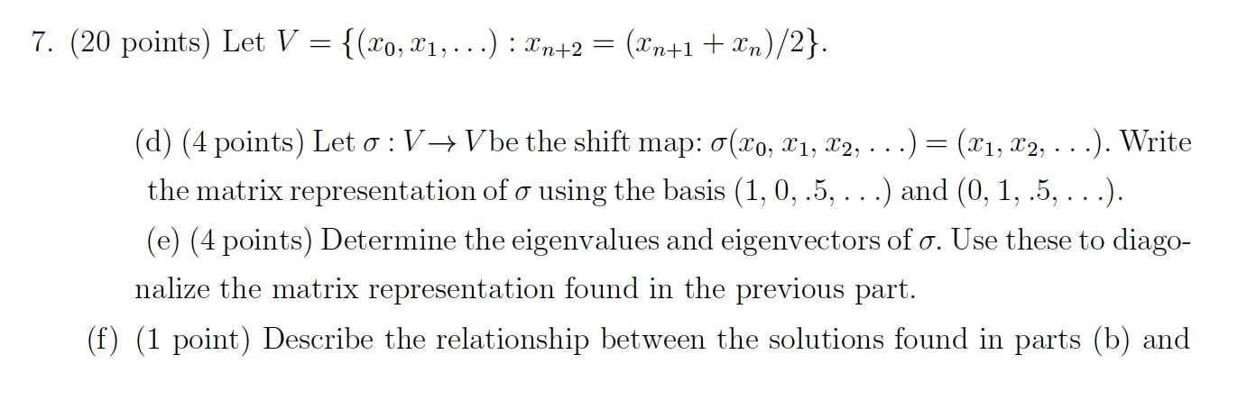 7. (20 points) Let V = f(x0; x1; : : :) : xn+2 = (xn+1 + xn)=2g. (...