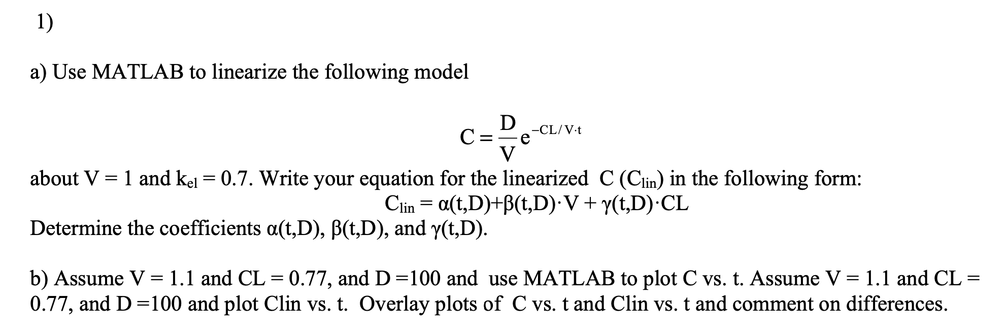 1) a) Use MATLAB to linearize the following model c=10-cm = abo...