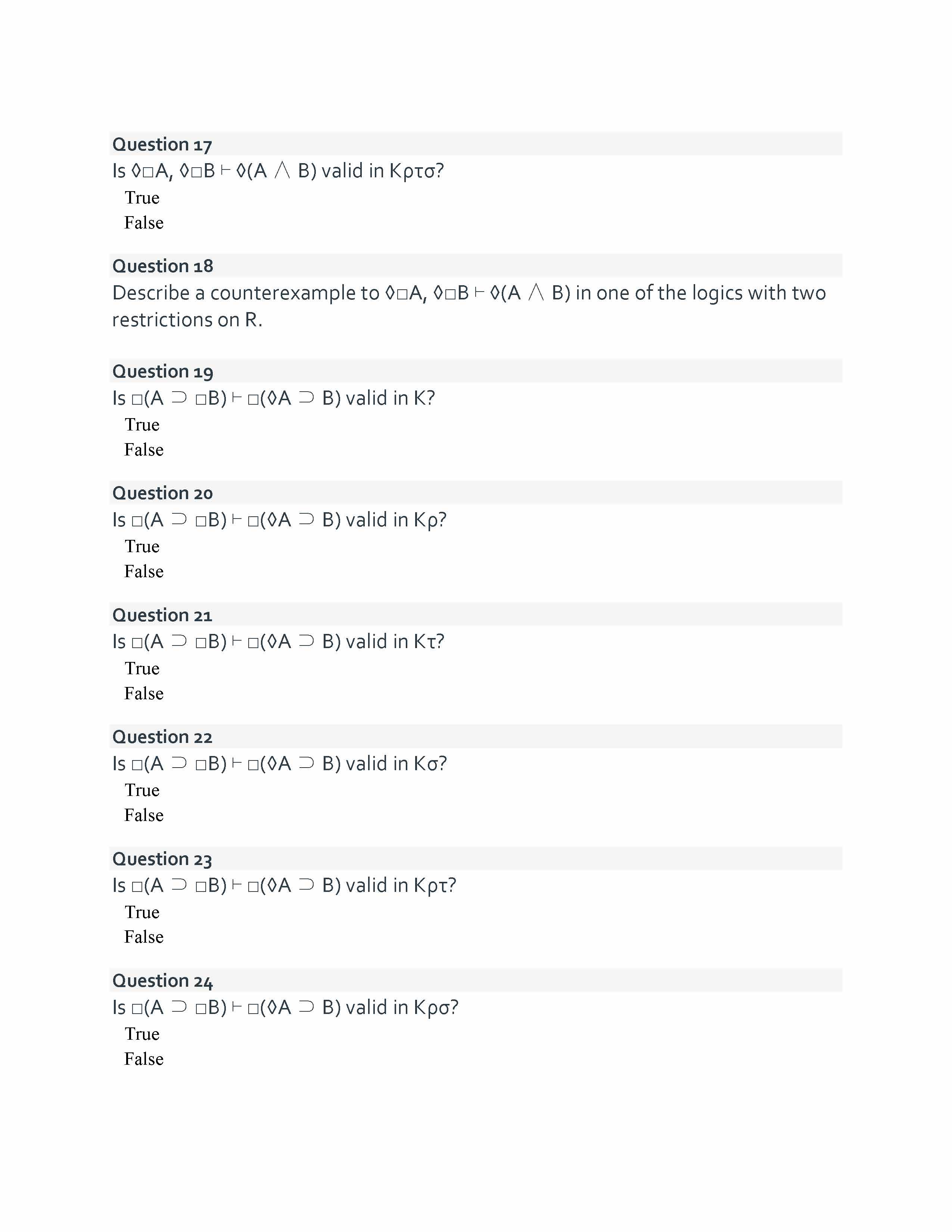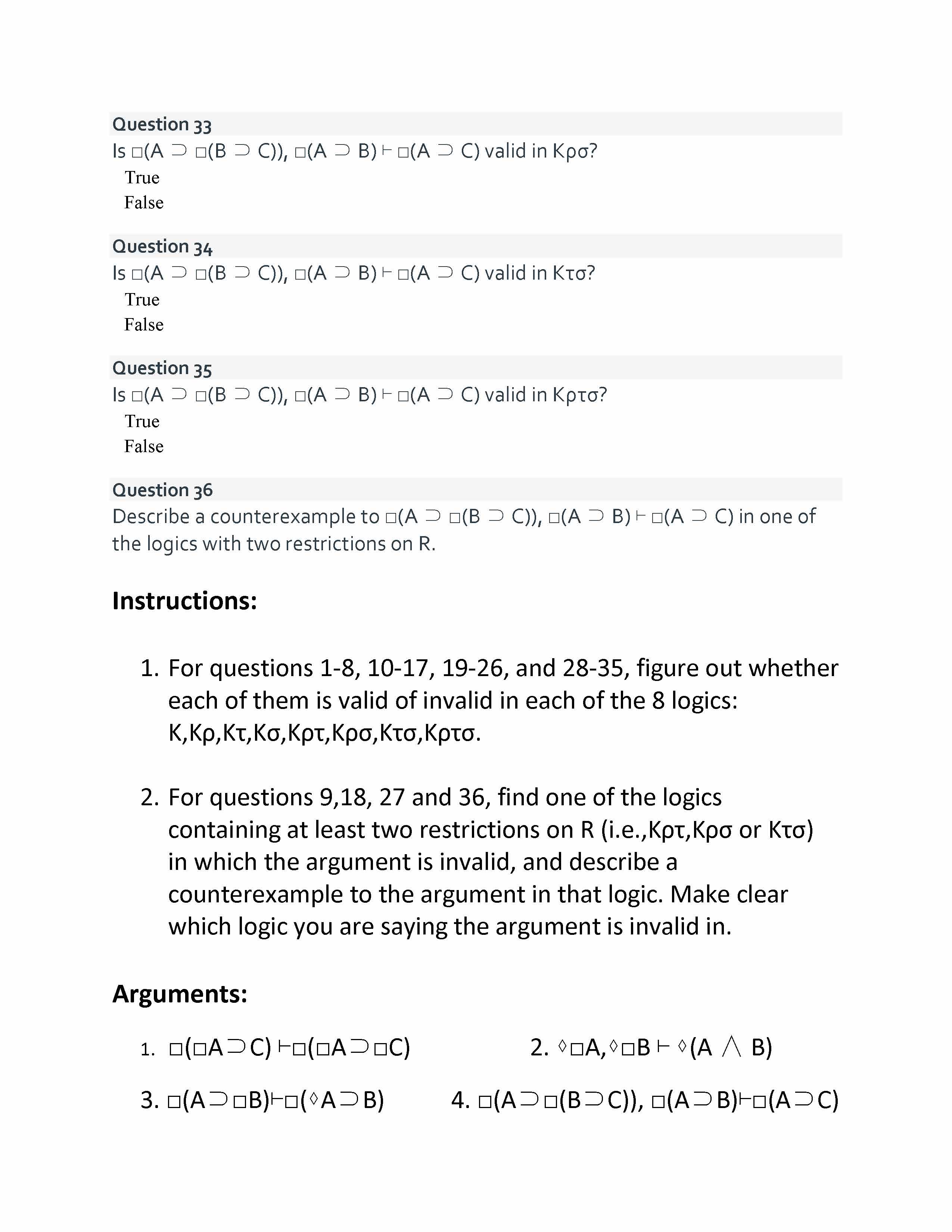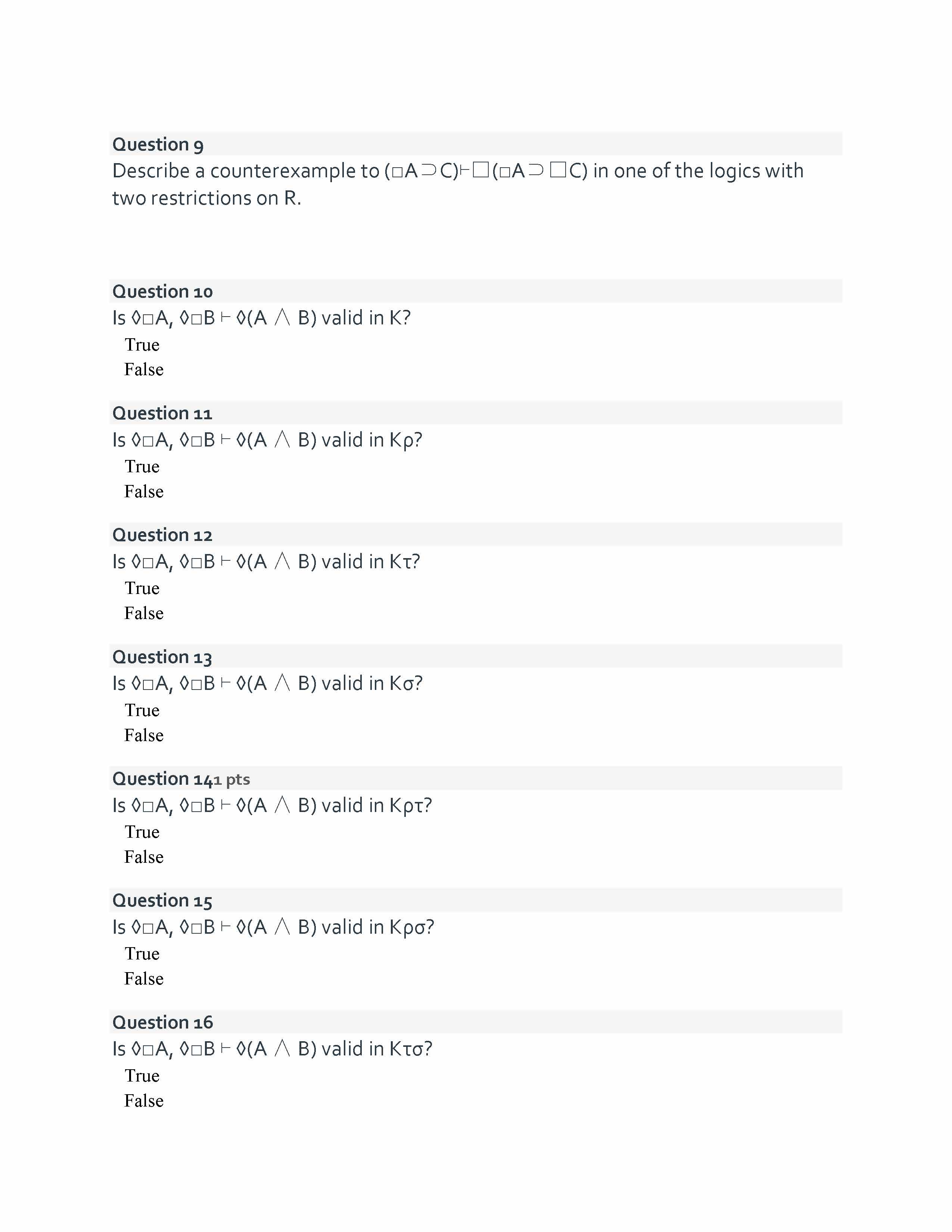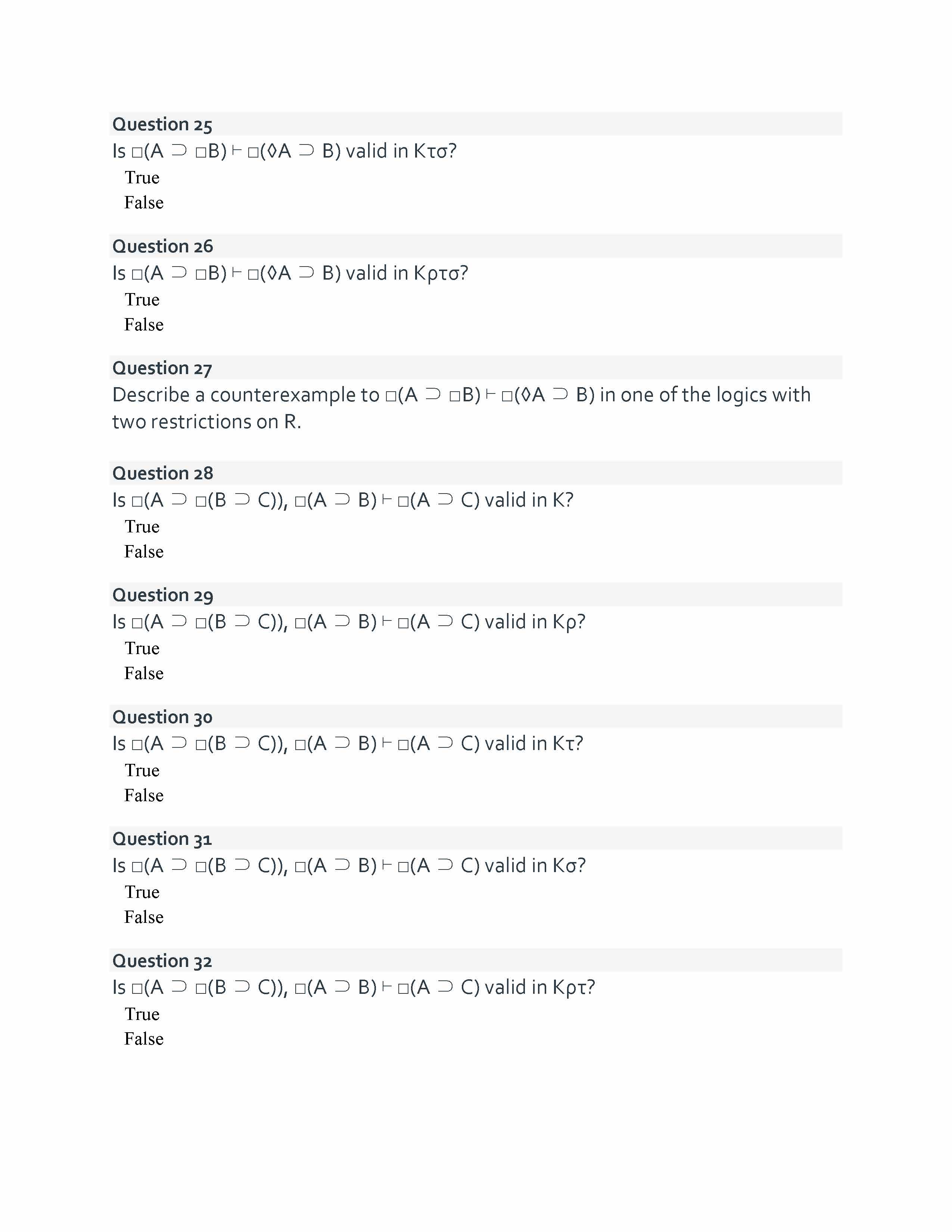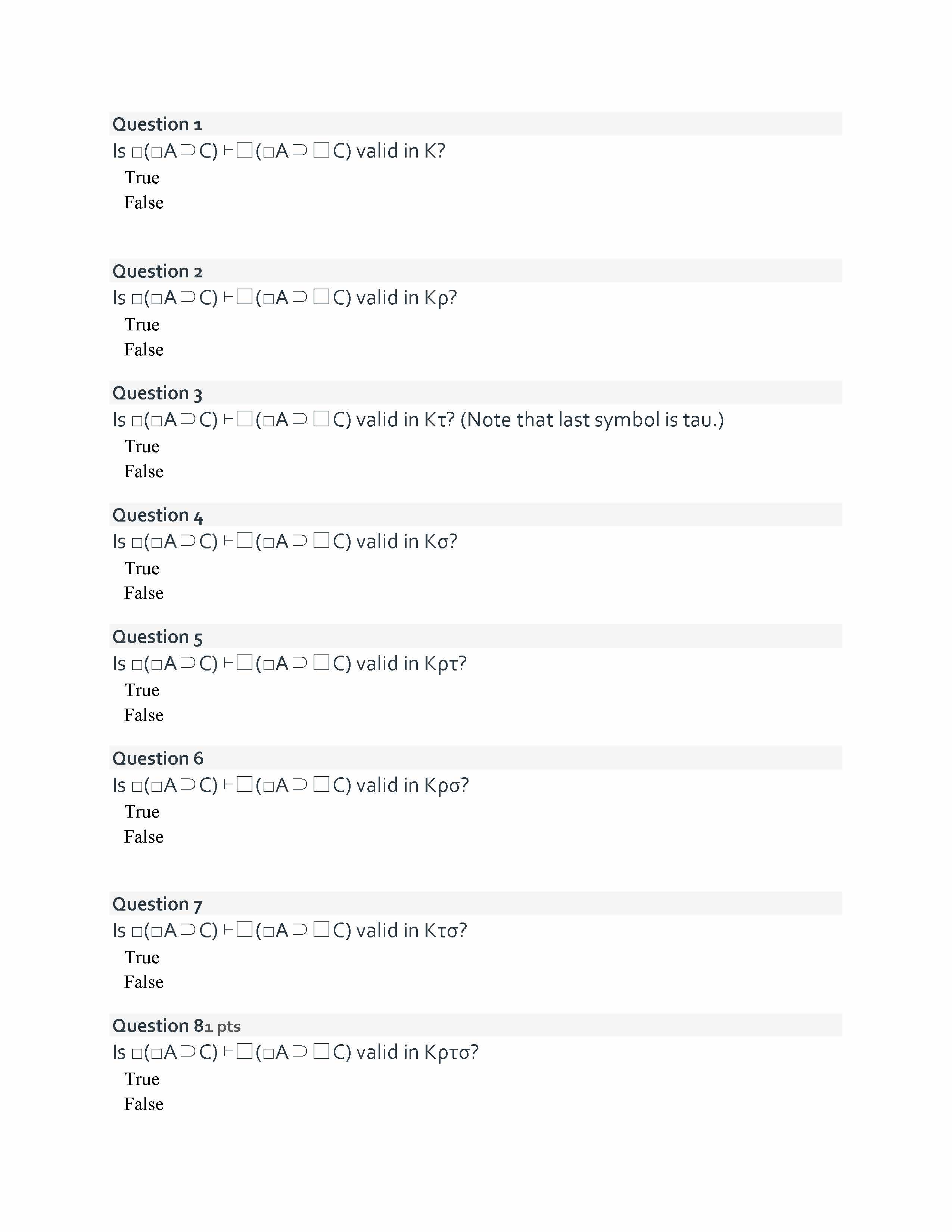 Question 1 Is □(□A⊃C) ⊢□(□A⊃□C) valid in K? True...