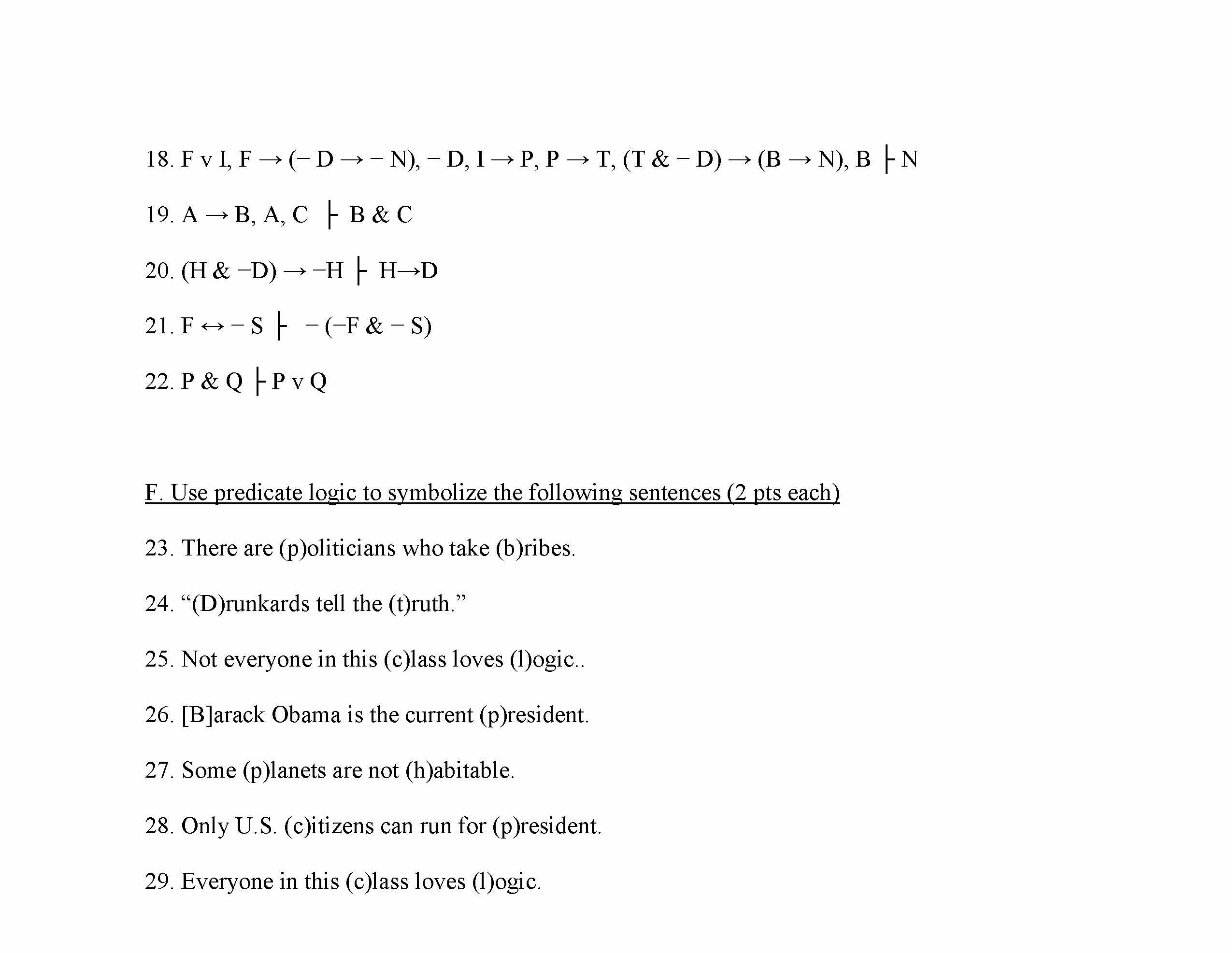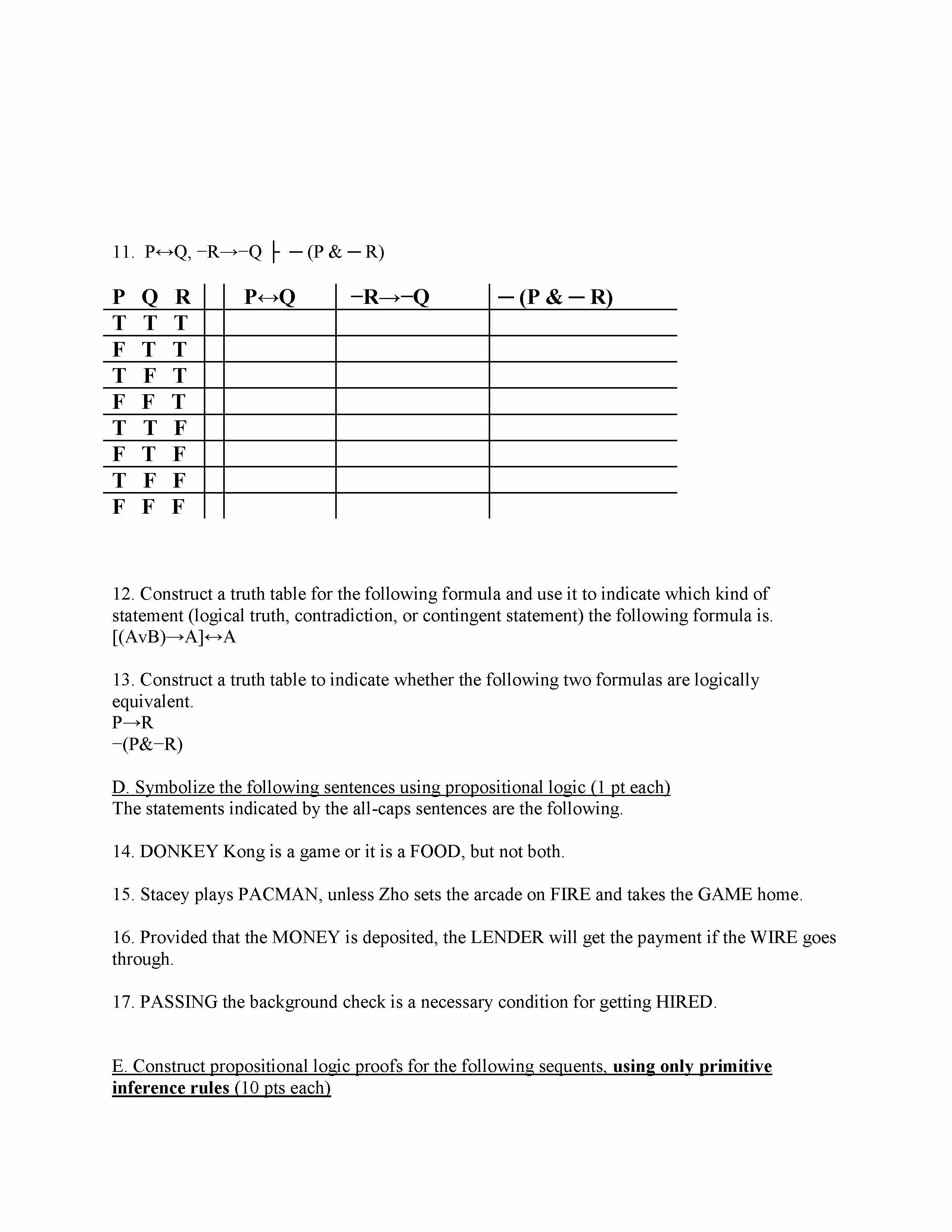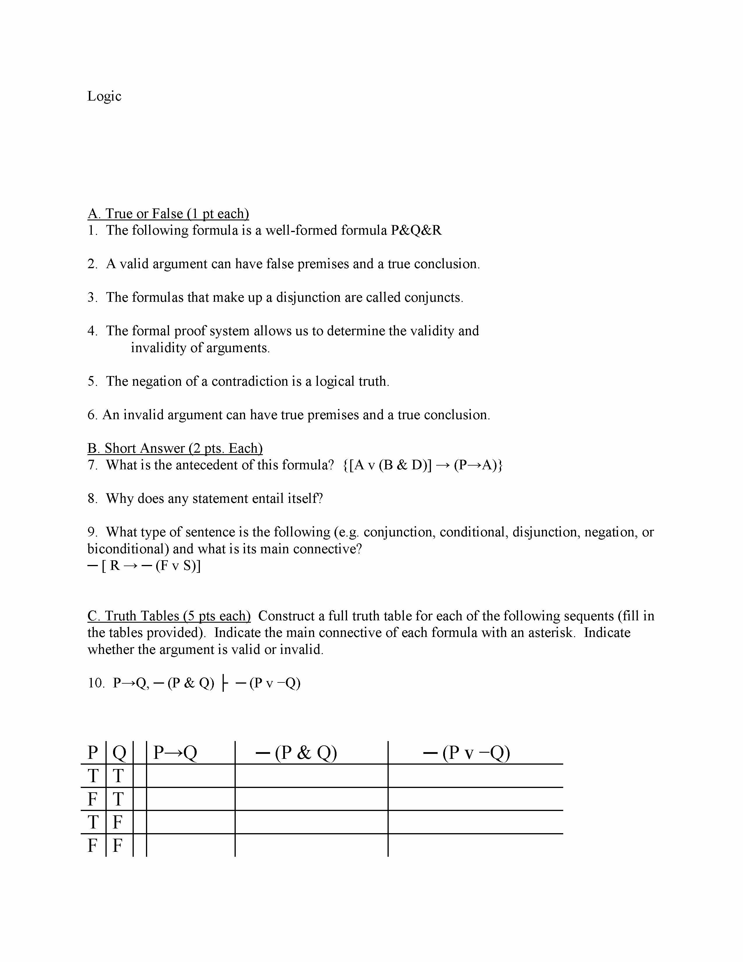 Logic A. True or False (1 pt each) 1. The following formula is a ...