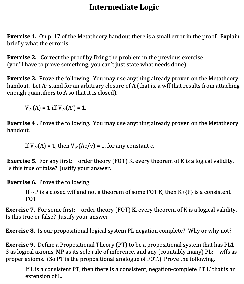 Intermediate Logic Exercise 1. On p. 17 of the Metatheory handout...