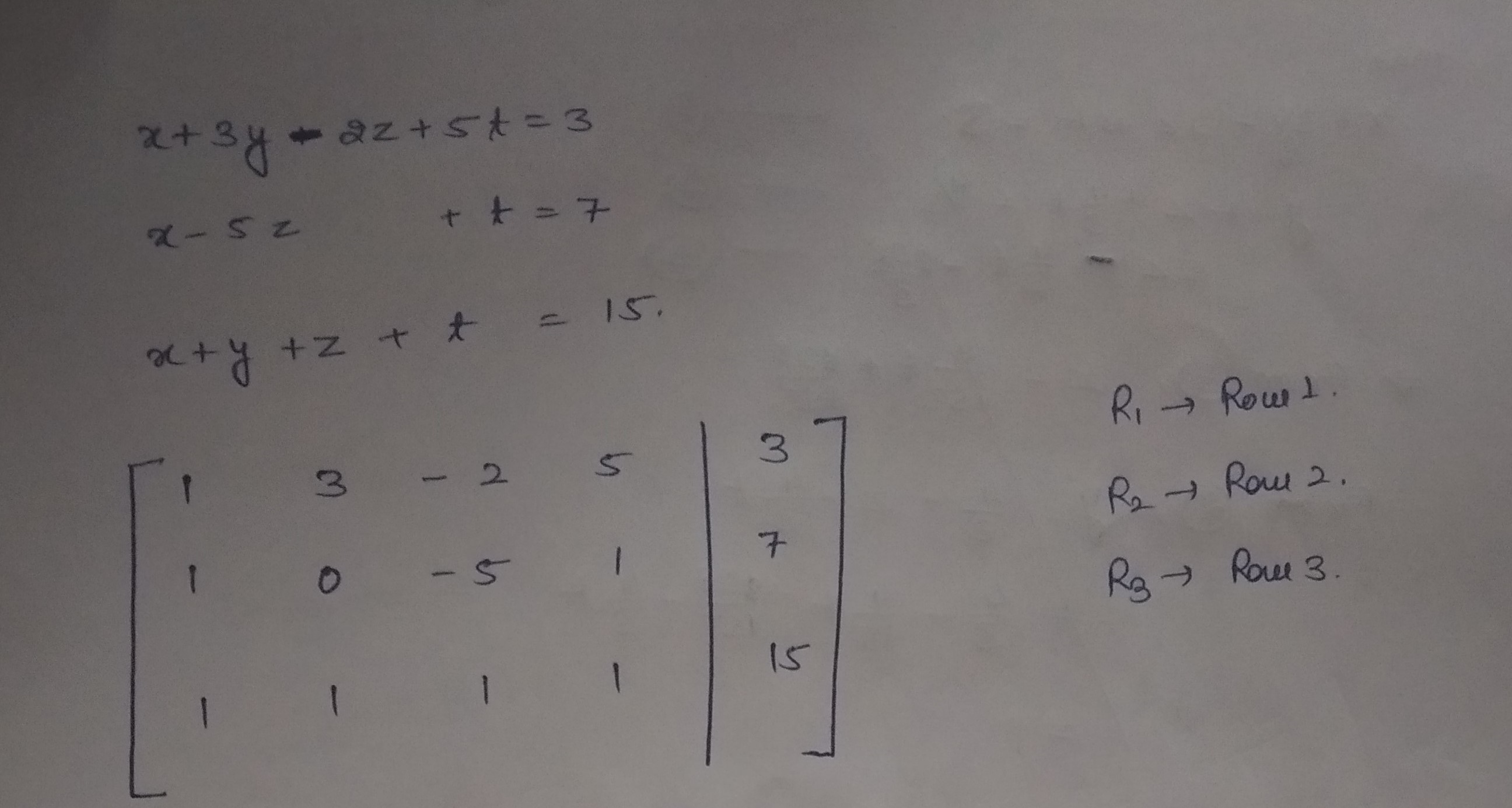 Solve the following equation: x + 3y - 2z + 5t = 3 x - 5z + t =...