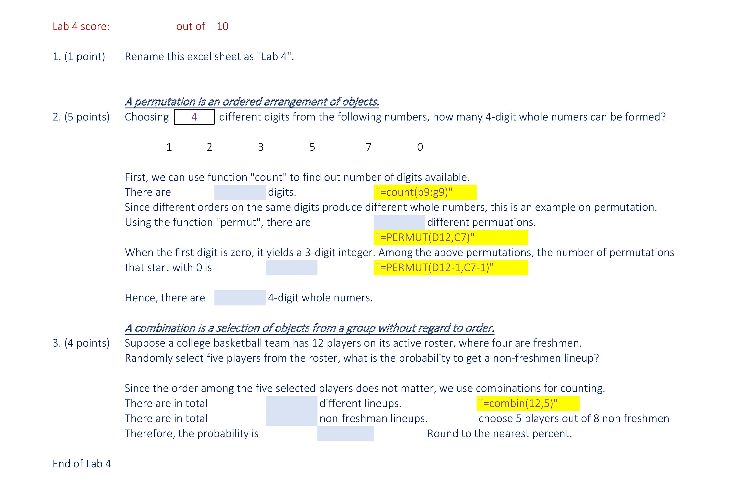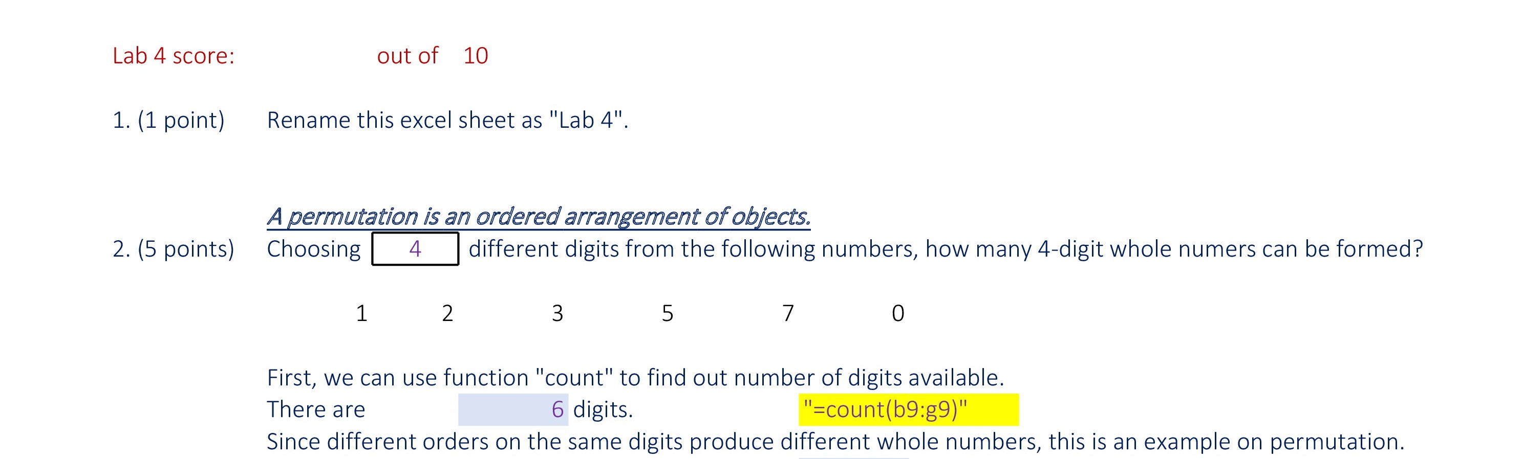 Lab 4 score: out of 10 1. (1 point) Rename this excel sheet as &...