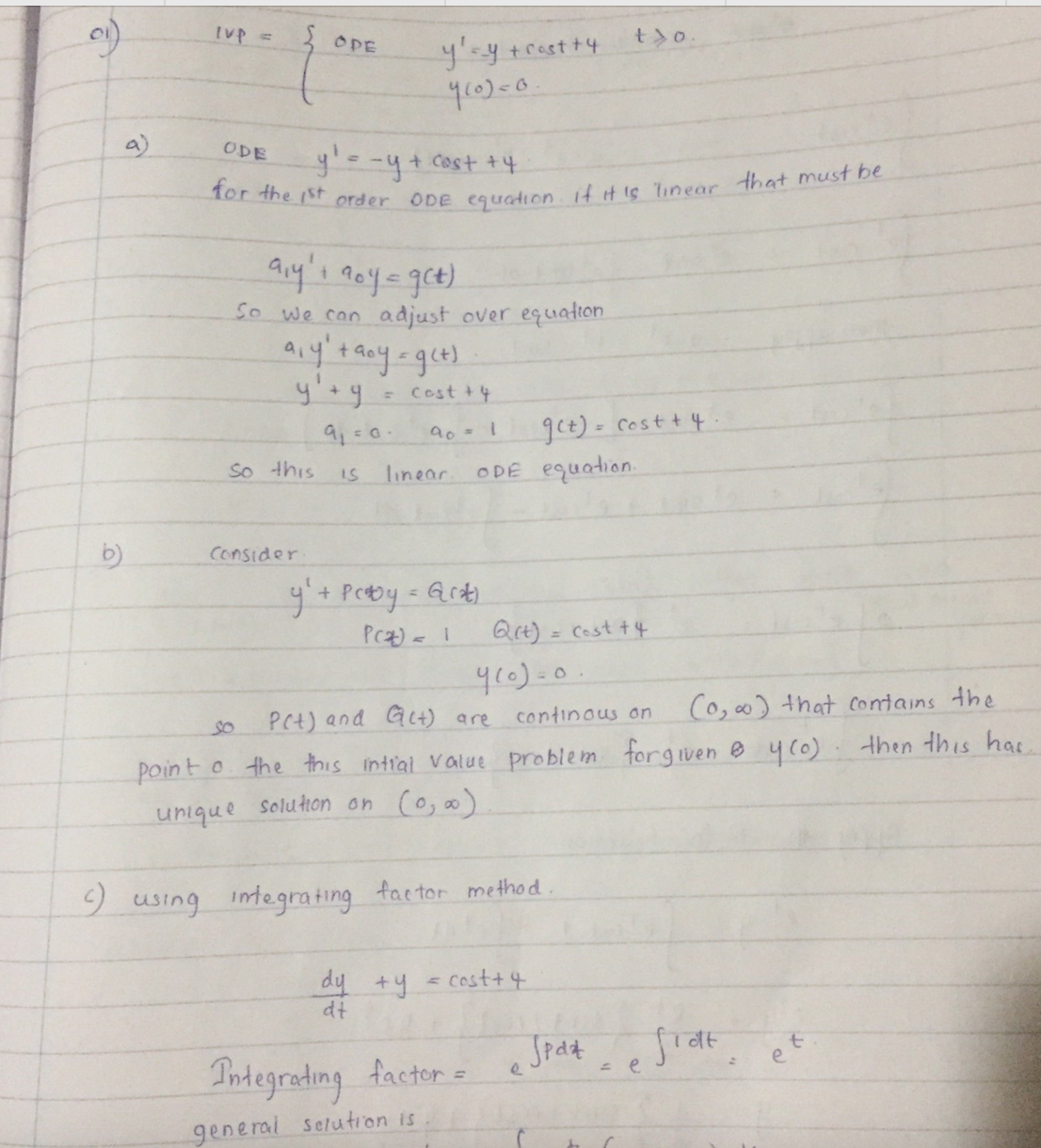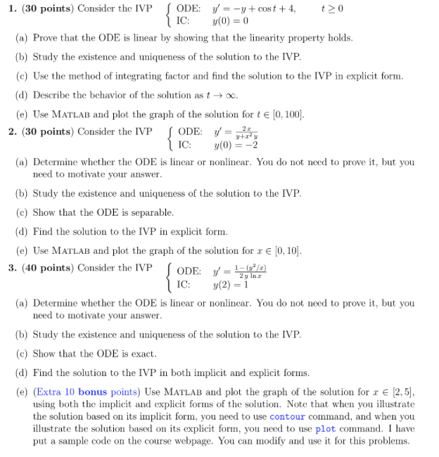 1. (30 points) Consider the IVP ODE: y' = -y+ cos t + 4, to IC:...