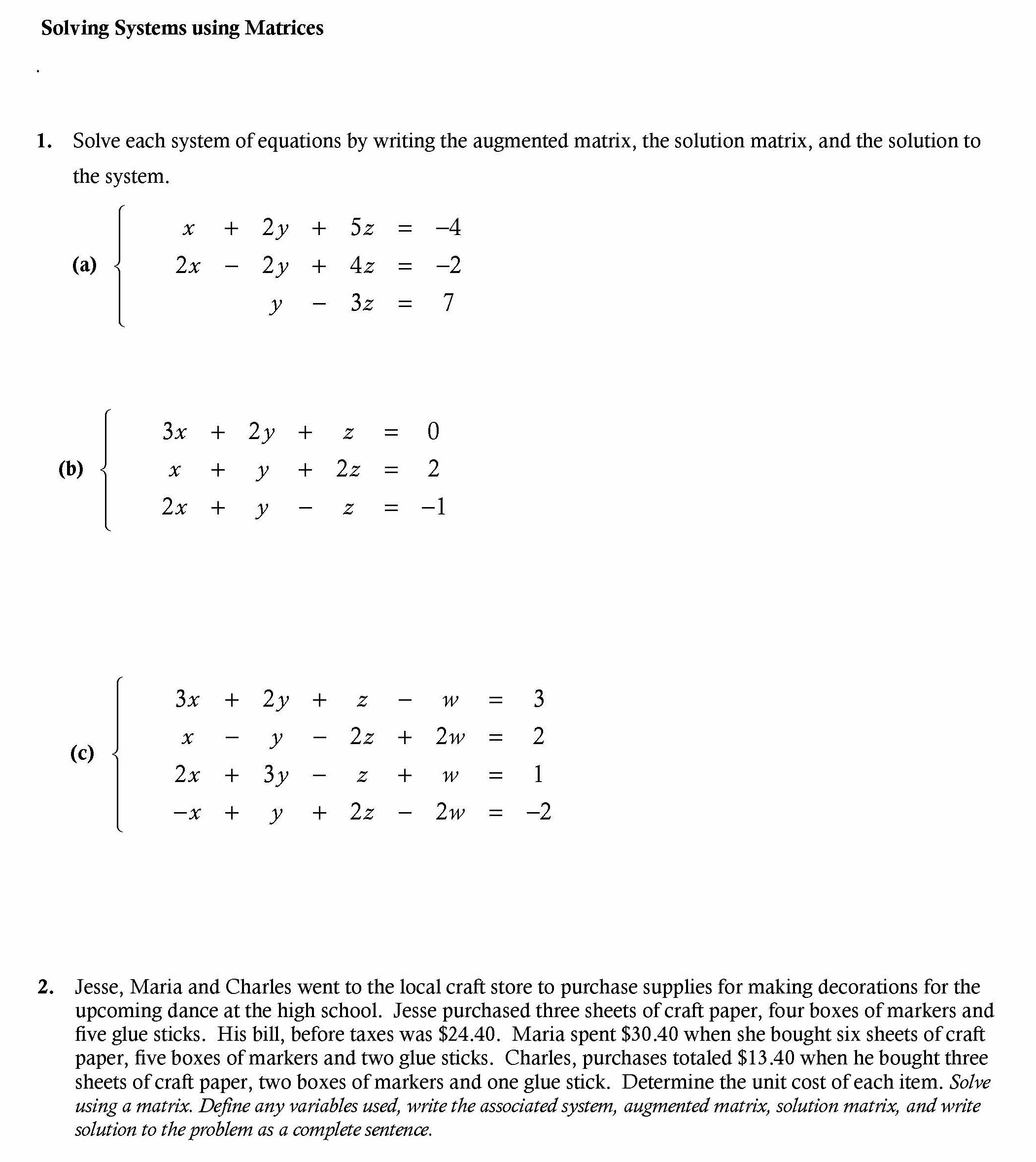 Solving Systems using Matrices . 1. Solve each system of equation...