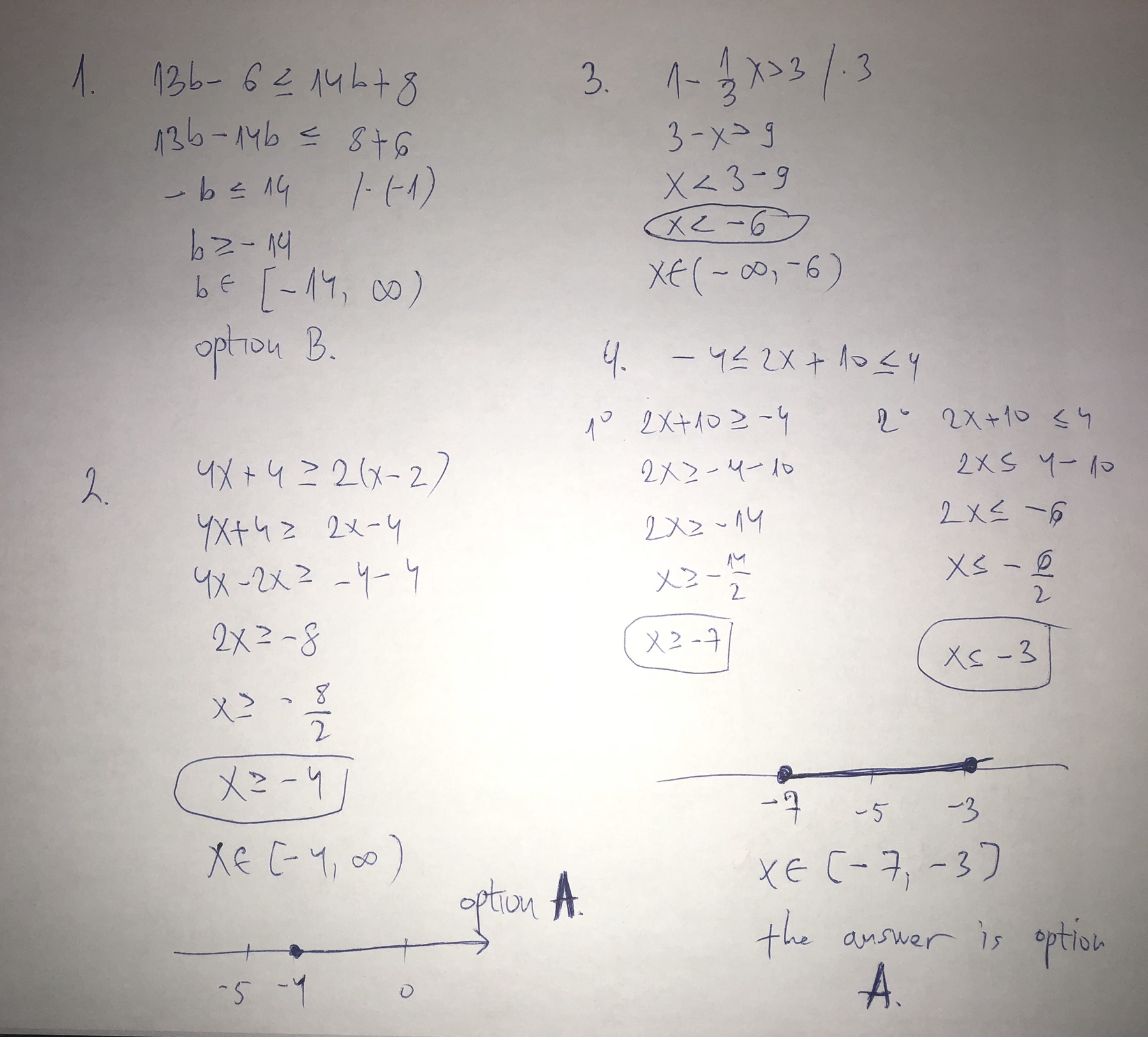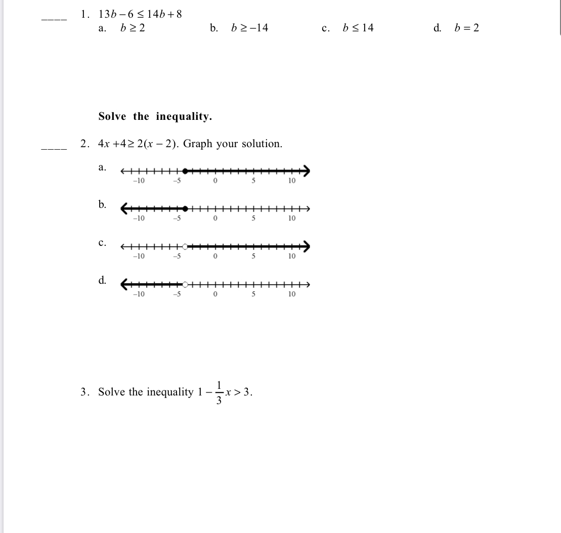 13b-6<14b+8 b 2 2 b. c. b < 14 d. b =2 Solve the inequal...