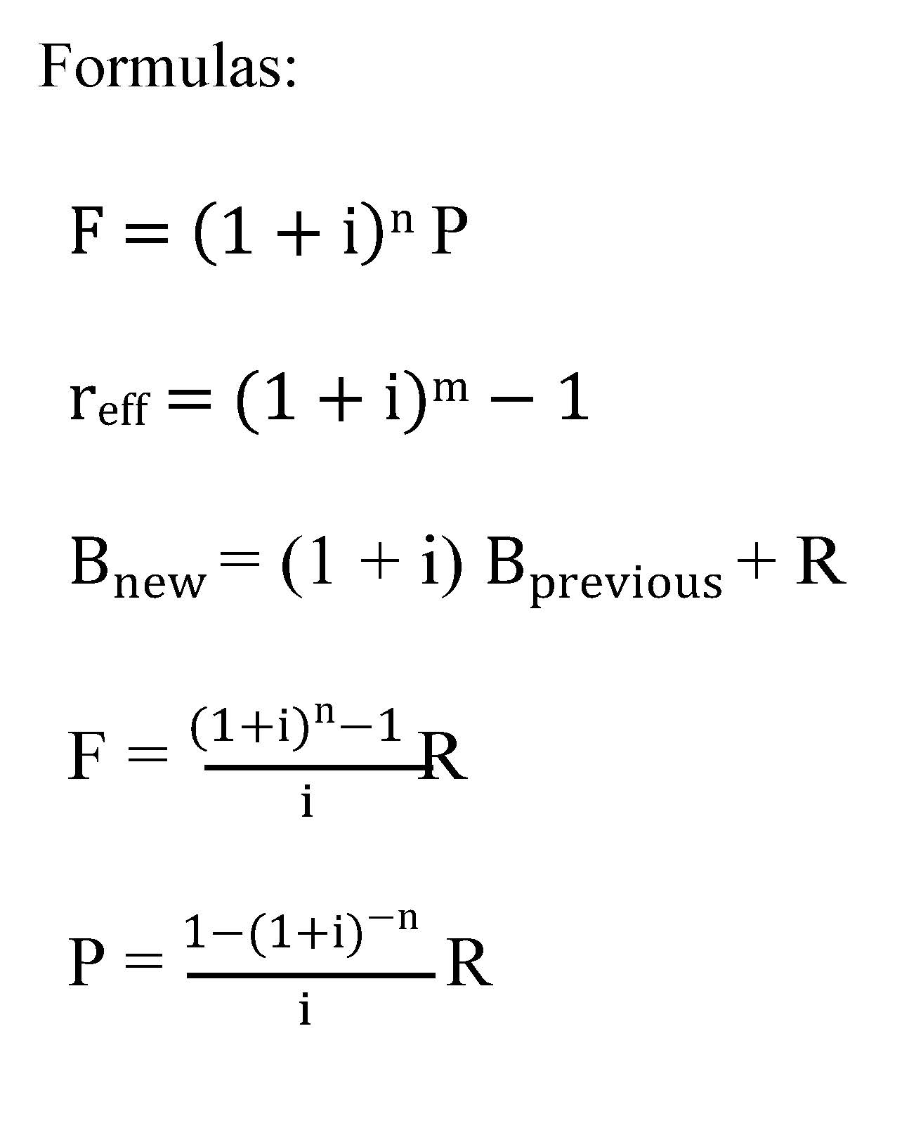 Formulas: F = (1 + i)n P reff = (1 + i)m − 1 Bnew = (1 + i...