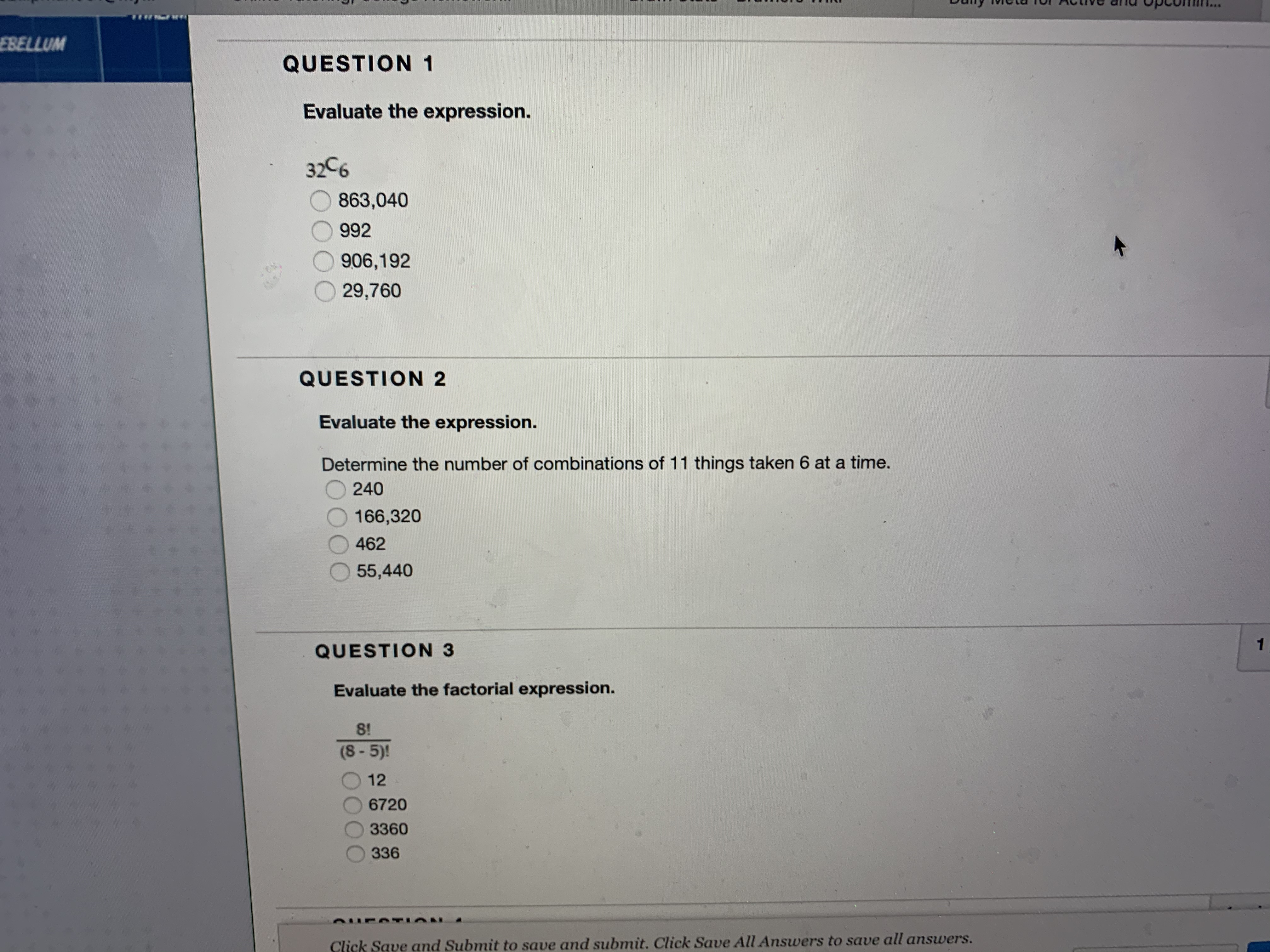 QUESTION 1 Evaluate the expression. 32C6 863,040 992 906,192...