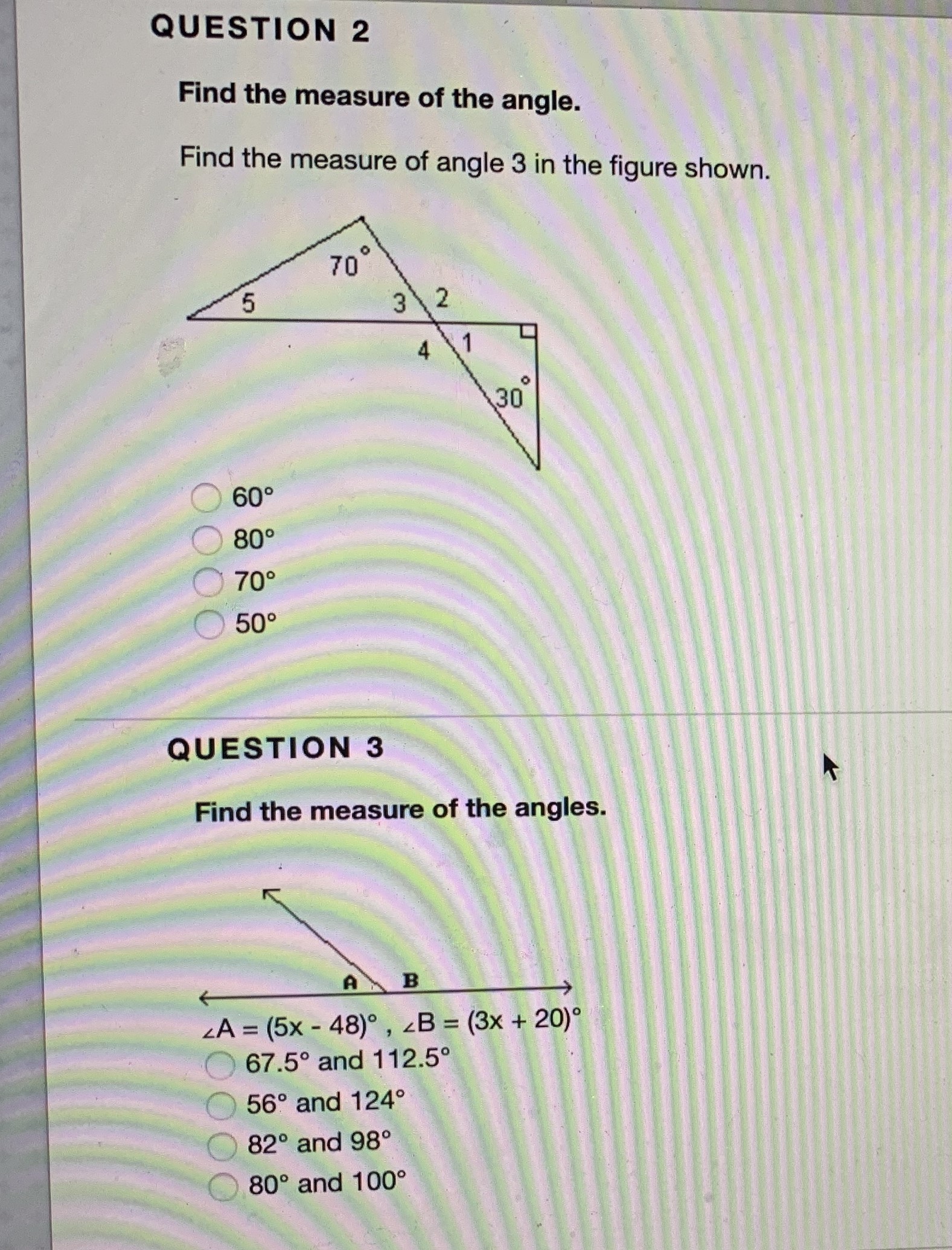 QUESTION 2 Find the measure of the angle. Find the measure of ang...