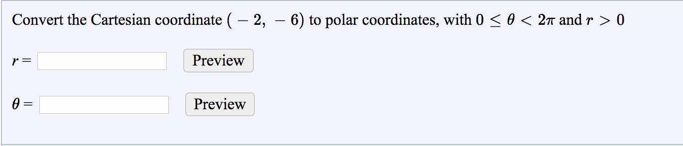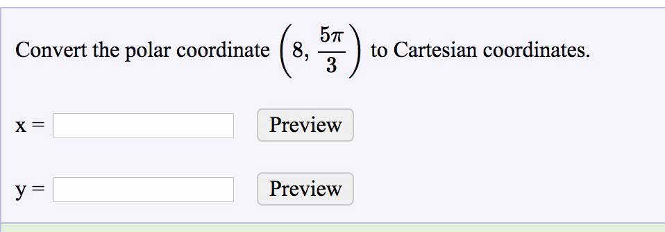 Convert the polar coordinate 8, 5380 to Cartesian coordinates. ...