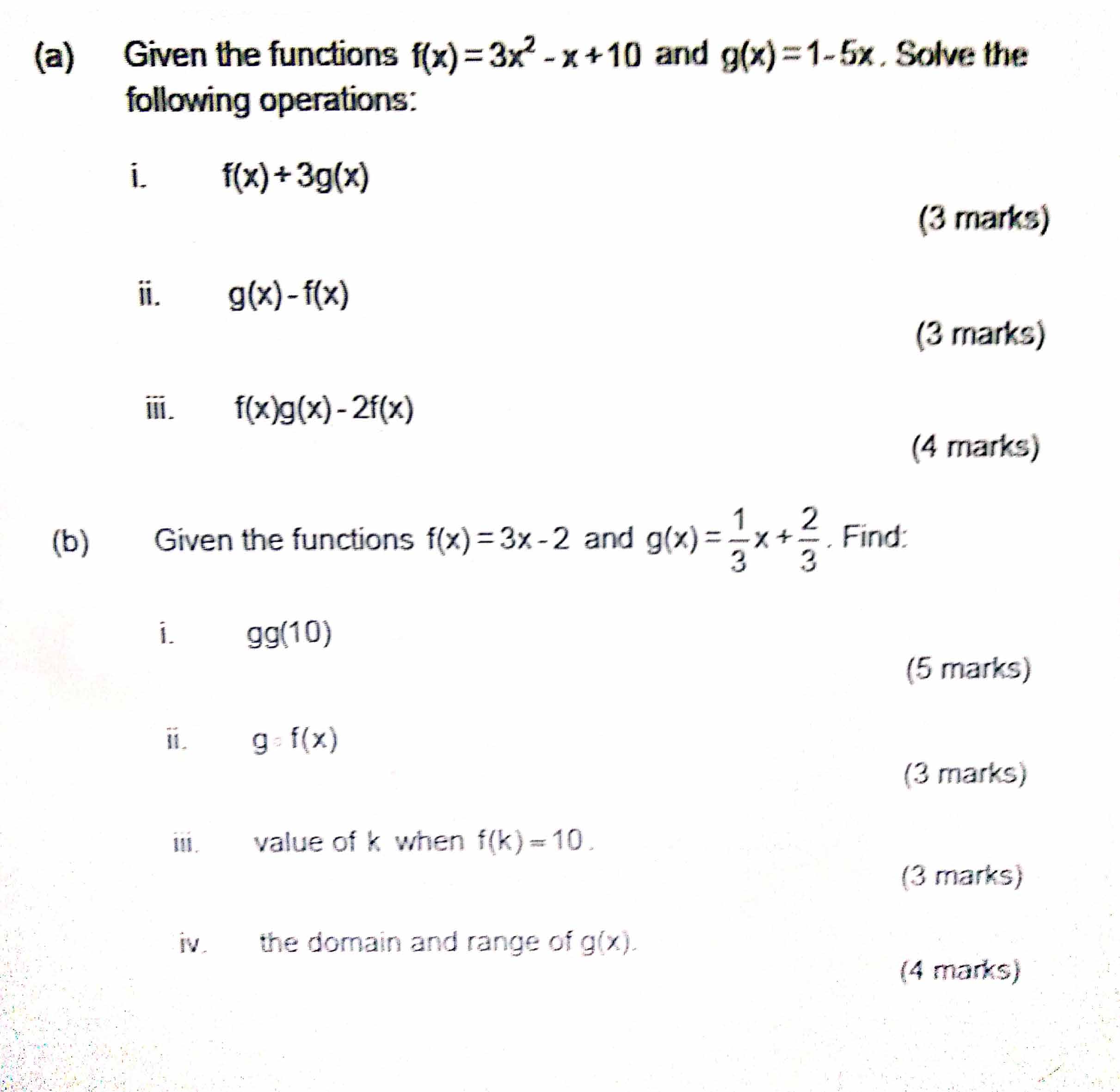 (a) Given the functions ((x)=3x-x+10 and g(x)=1-5x. Solve the fol...