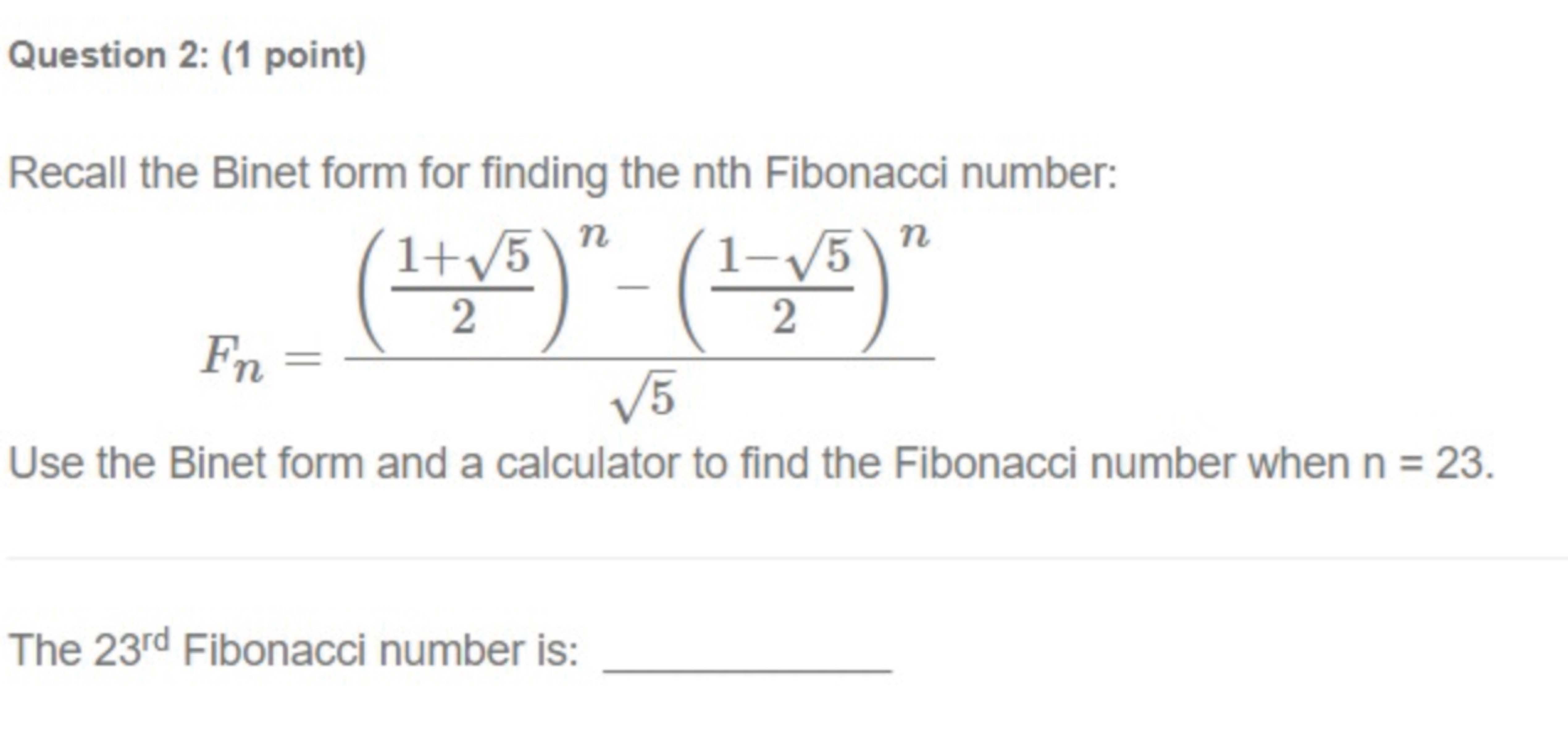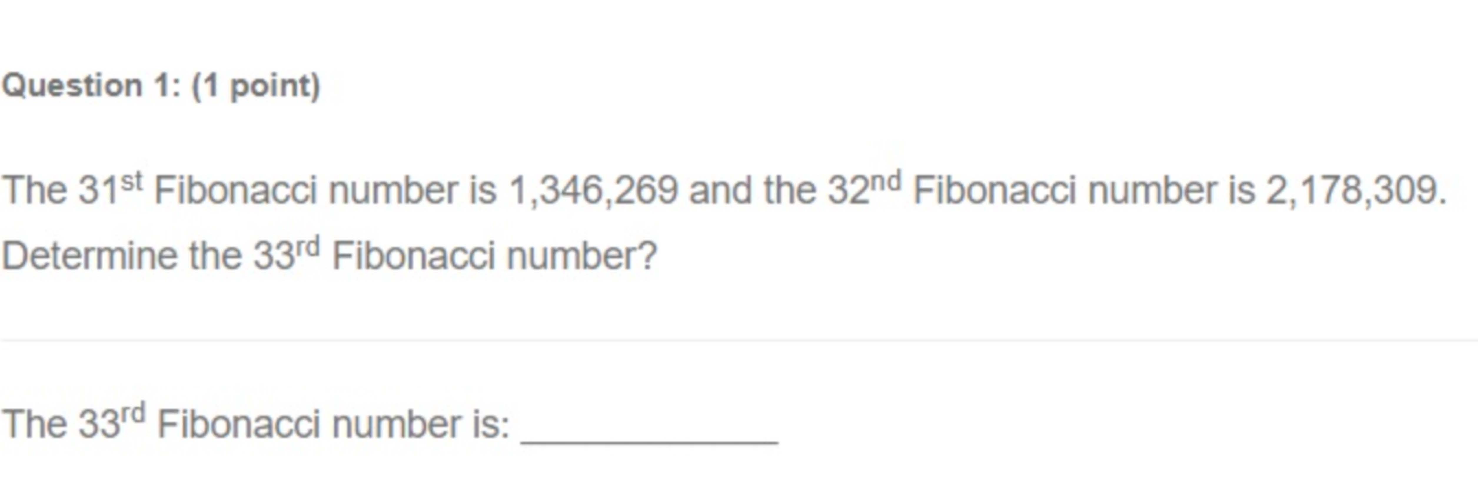 Question 1: (1 point) The 31st Fibonacci number is 11346,269 and t...