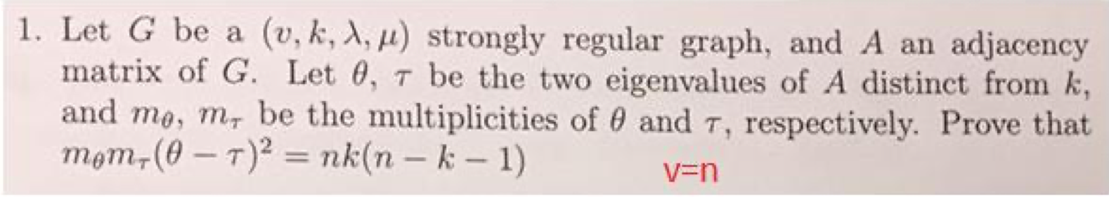 1. Let G be a (v, k, 1, 11) strongly regular graph, and A an adjac...