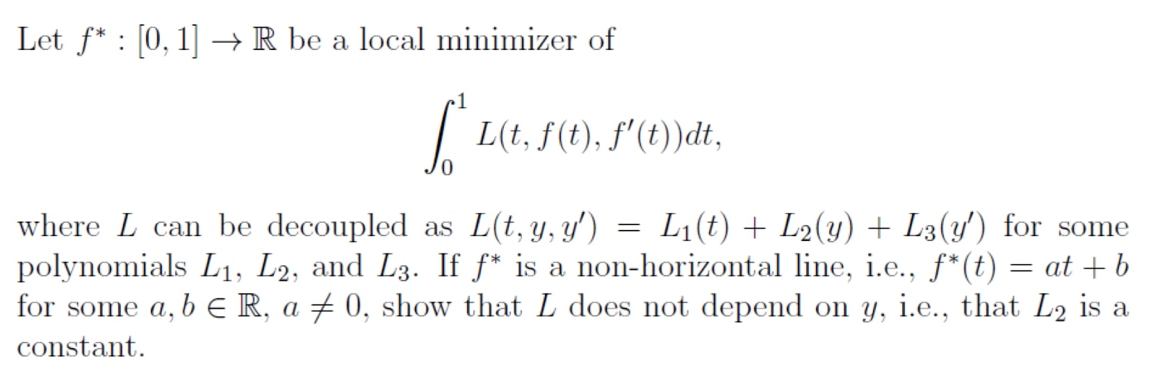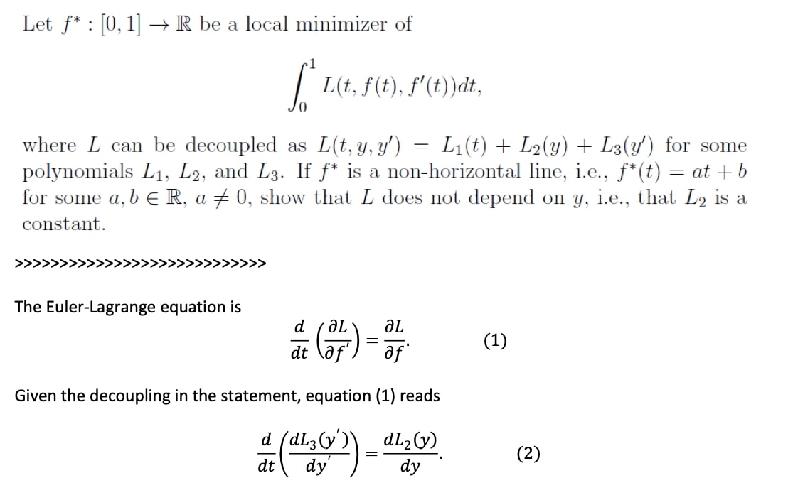 Let f* : [0,1] R be a local minimizer of 1 J, L(t, f it), f'(t))...