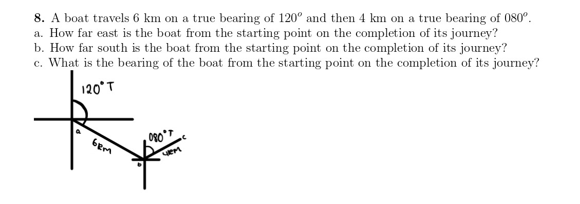 8. A boat travels 6 km on a true bearing of 120° and then 4 km on...