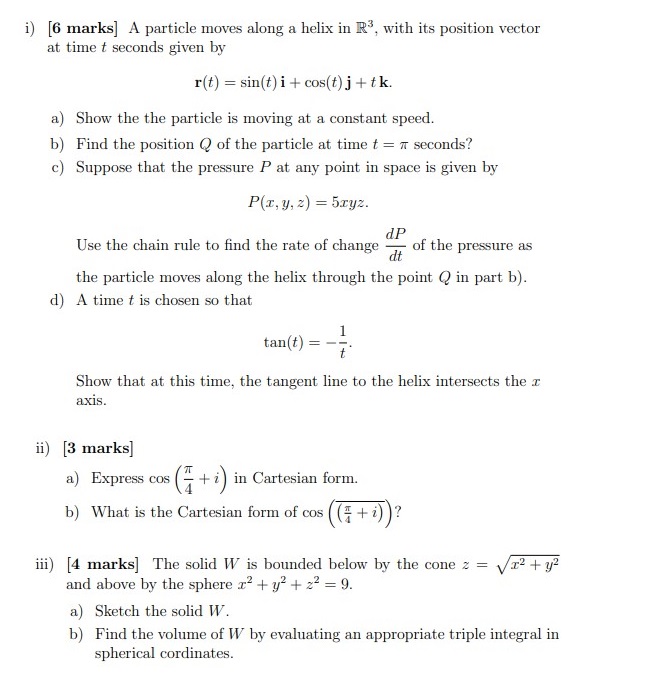 i) 6 marks] A particle moves along a helix in R3, with its position...