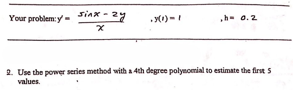 Your problem:y = sinx - 2y y(1)=1 , h=0.2 x 2. Use the power se...
