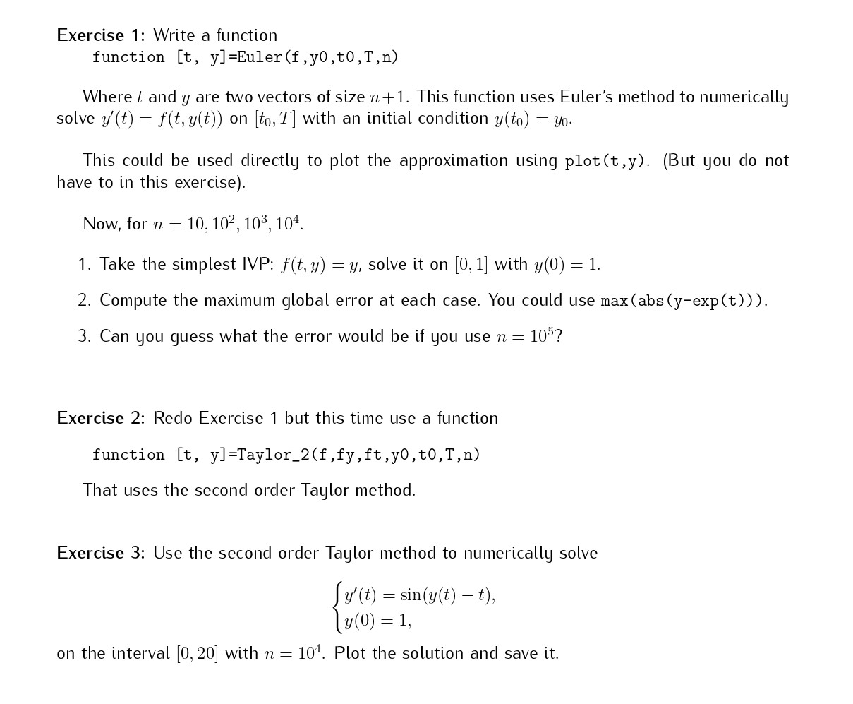 Exercise 1: Write a function function [t, y] =Euler (f, y0, t0, ,T...