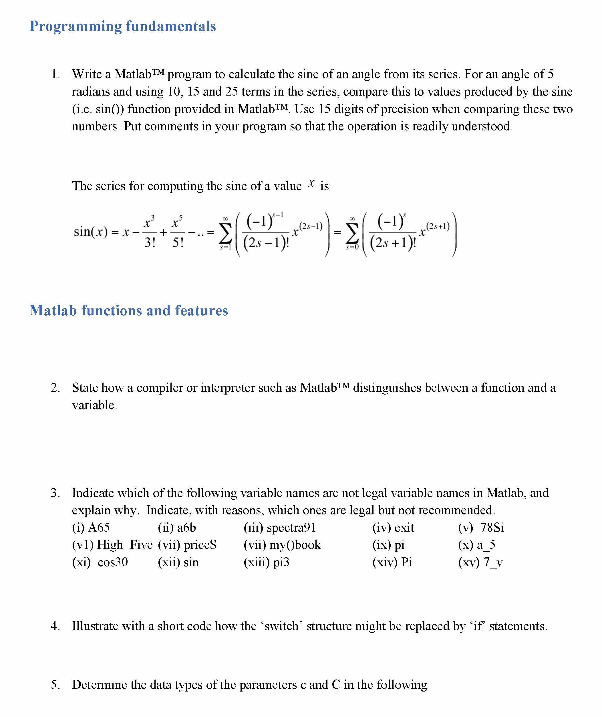 Programming fundamentals 1. Write a Matlabâ„¢ program to calculate...