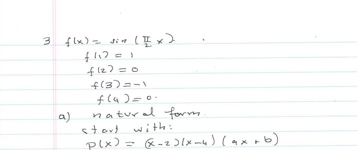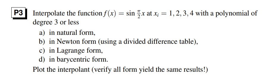 P3 Interpolate the function f(x) = sin at Xi = 1, 2, 3, 4 with a p...