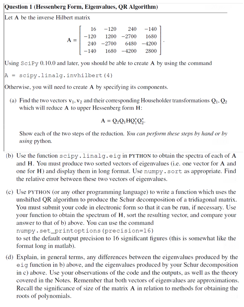 Question 1 (Hessenberg Form, Eigenvalues, QR Algorithm) Let A be t...