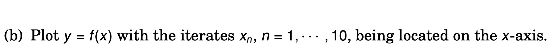 (b) Plot y = f(x) = with the iterates Xn, n= 1, . . . 10, being loc...