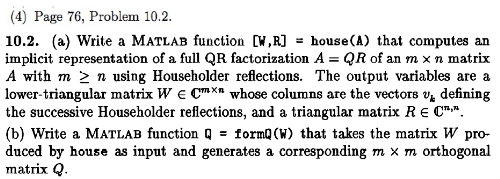 (4) Page 76, Problem 10.2. 10.2. (a) Write a MATLAB function [W,R]...