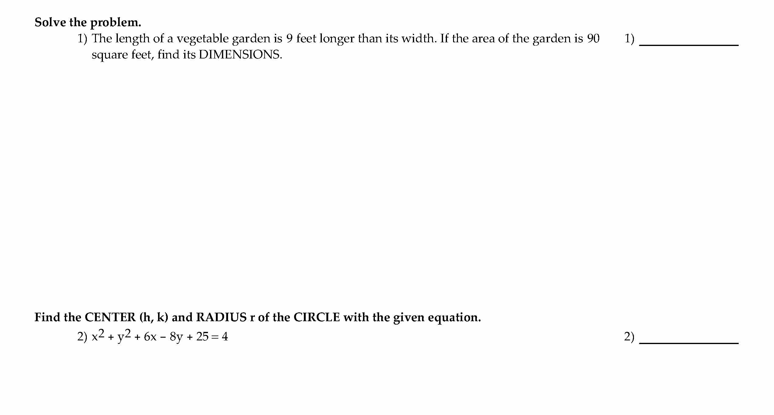 Solve the problem. 1) The length of a vegetable garden is 9 feet l...