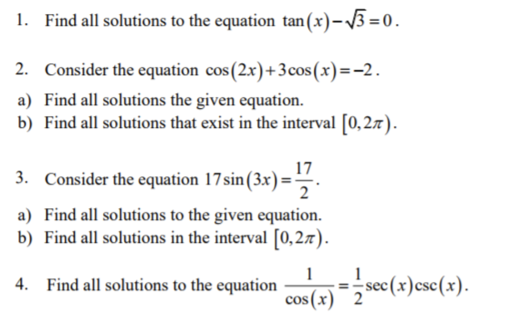 1. Find all solutions to the equation tan (x) - 3=0 2. Consider th...