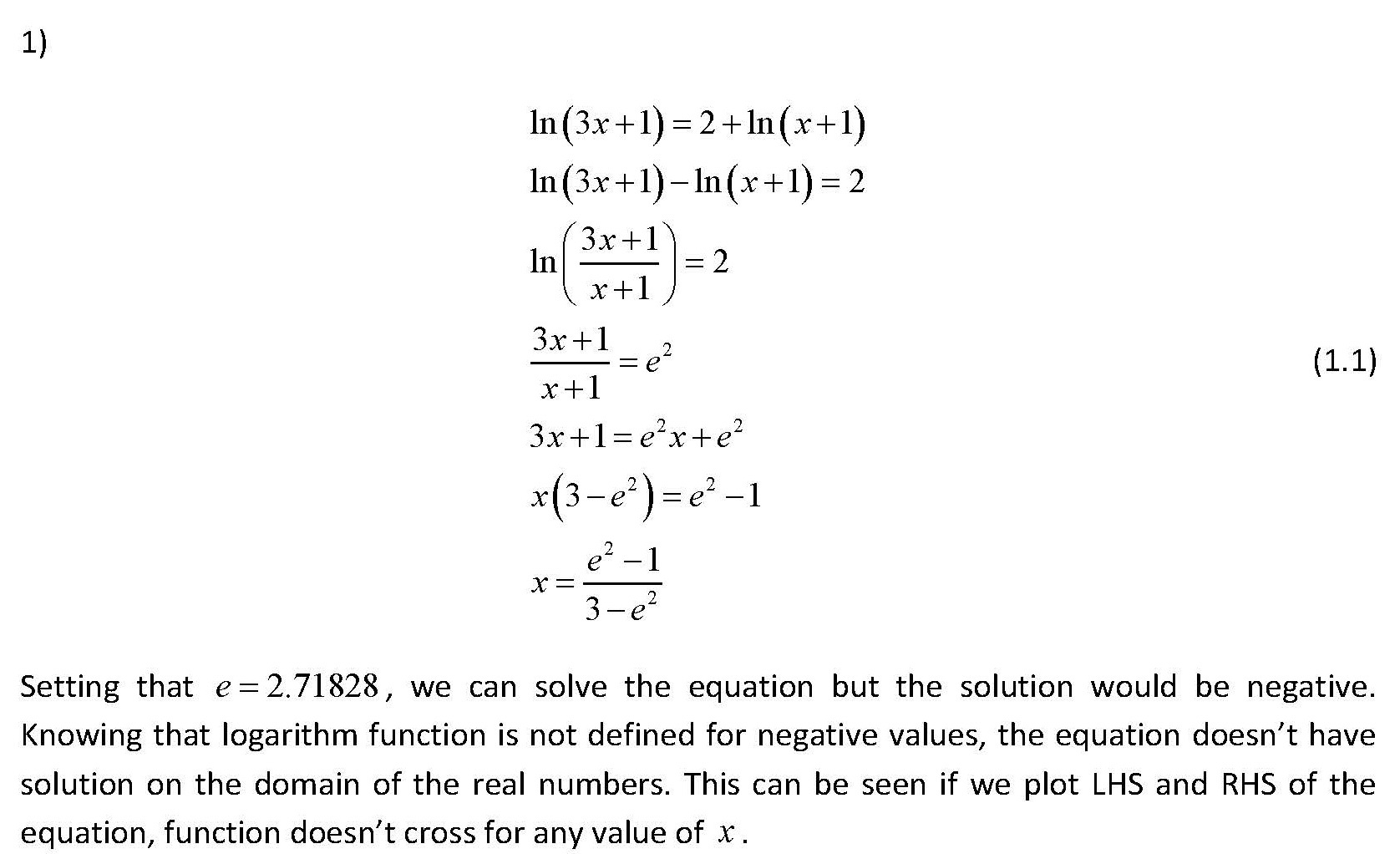 1) Solve the equation ln(3x+1) = 2ln(x+1). If there is a solution, ...
