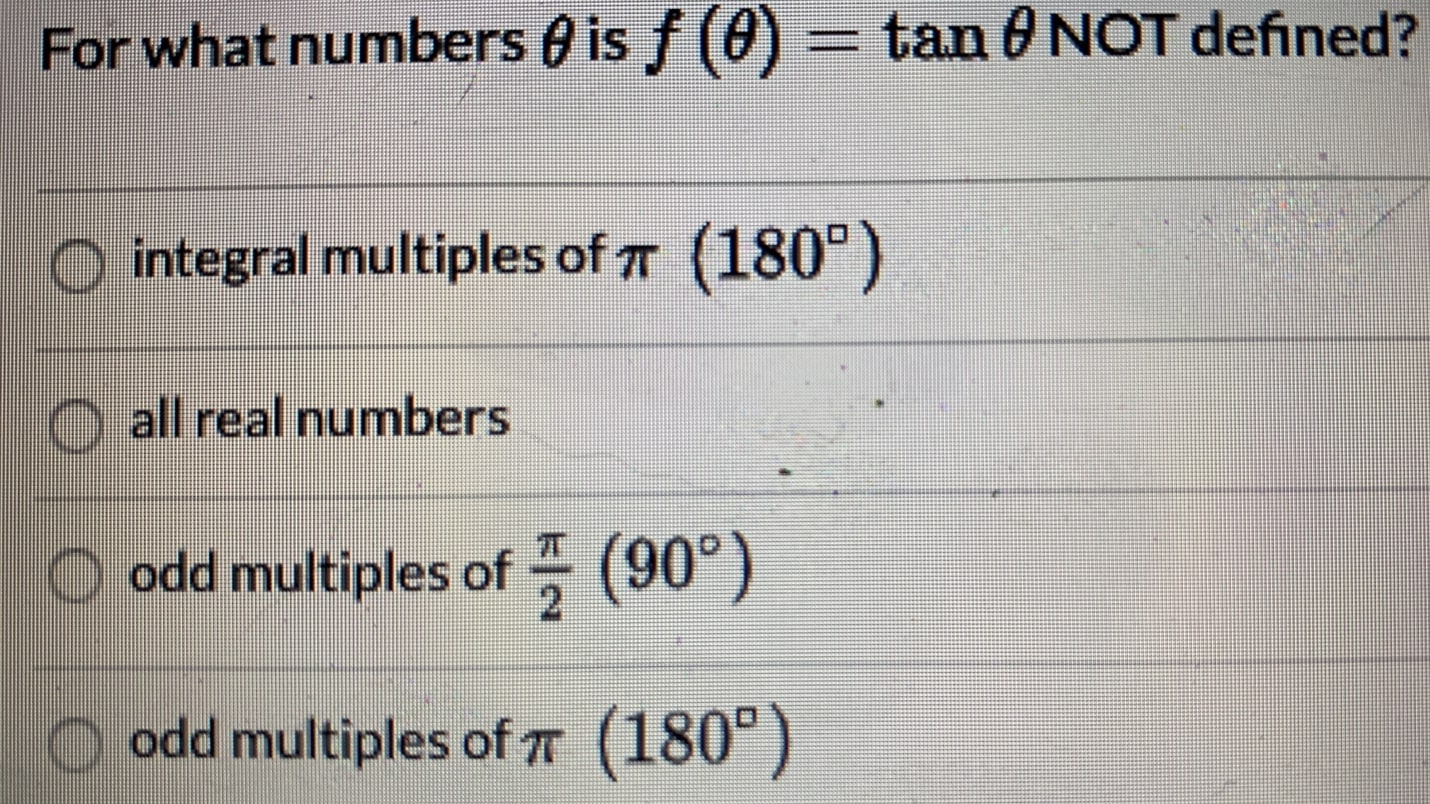 For what numbers 0 is f(0) = tan 0 NOT defined? integral multiples...