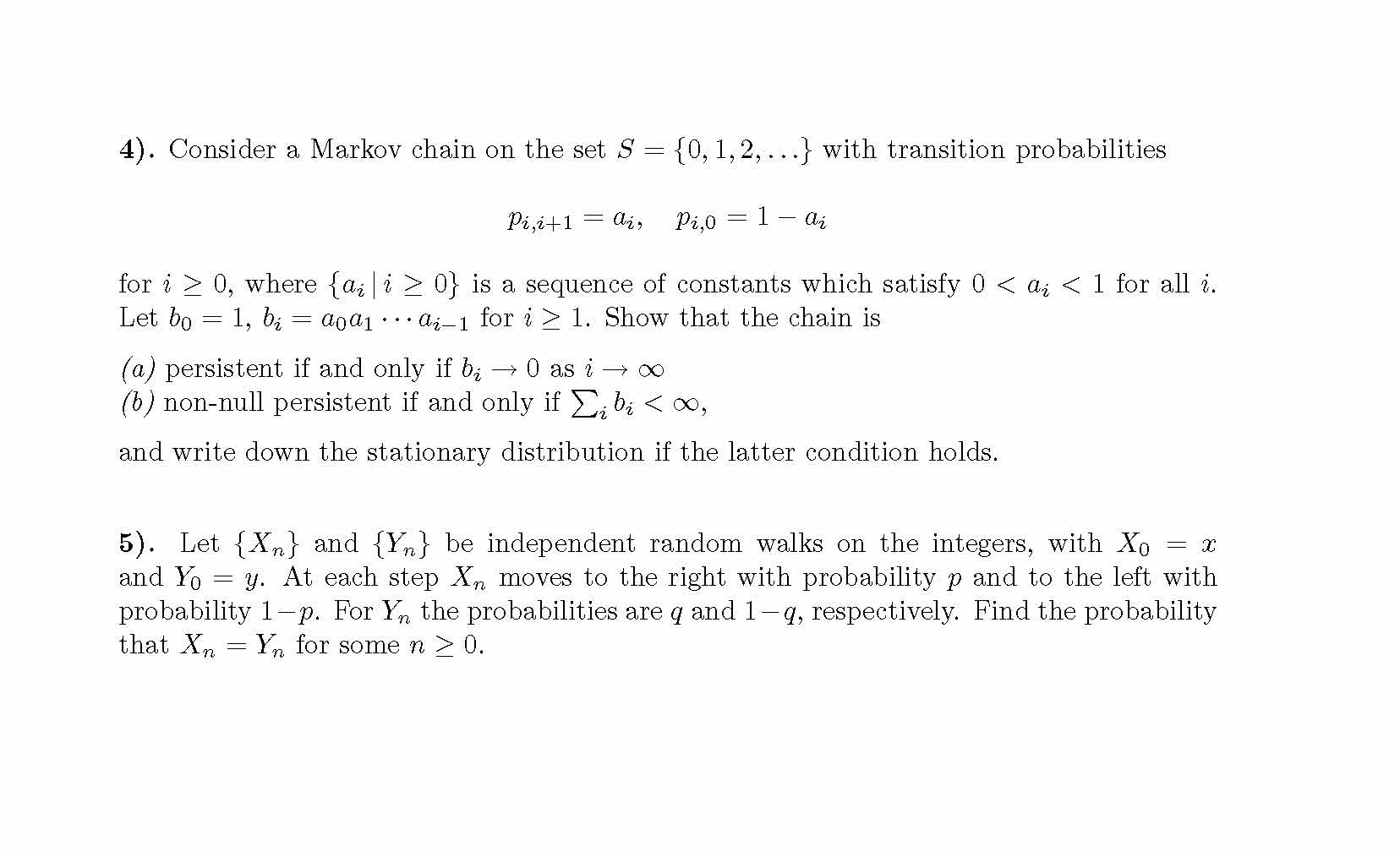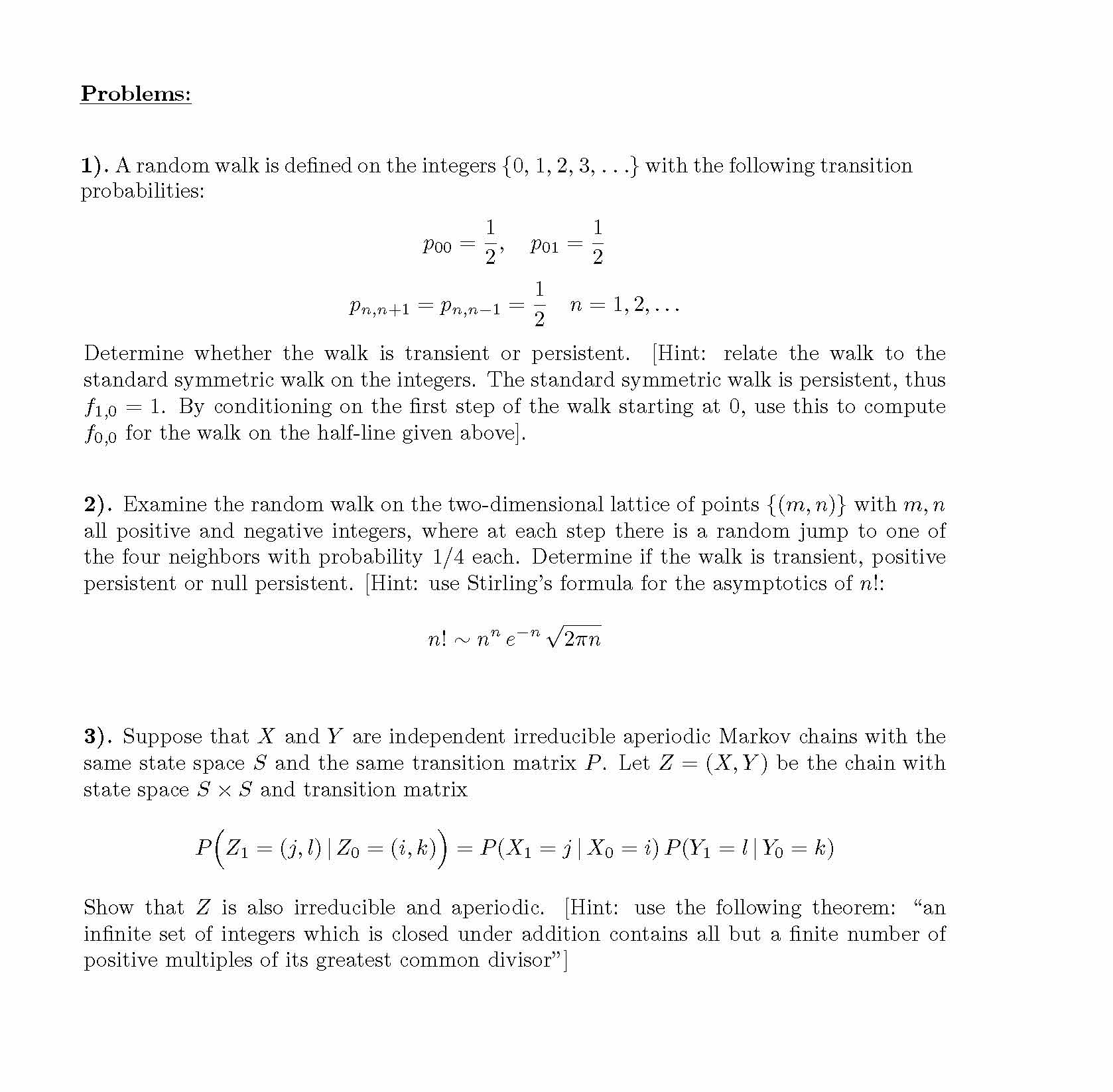 Problems: 1). A random walk is defined on the integers {0, 1, 2, 3...