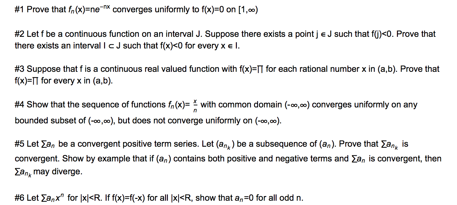 #1 Prove that fn(x)=ne-nx converges uniformly to f(x)=0 on [1,00)...