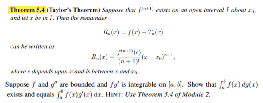 Theorem 5.4 (Taylor's Theorem) Suppose that f(n+1) exists on an ope...