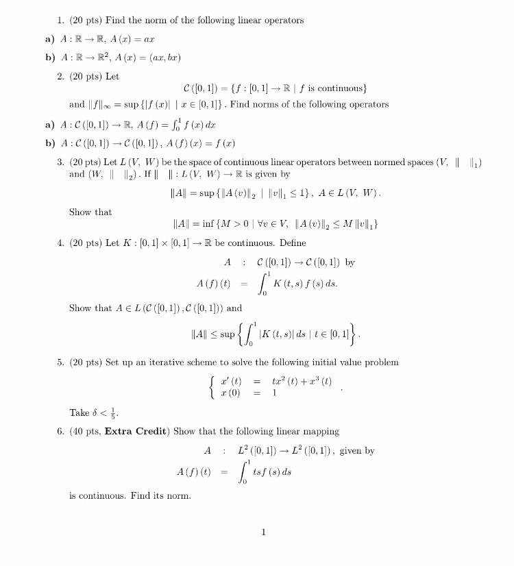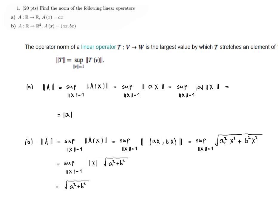 1. (20 pts) Find the norm of the following linear operators a) A:...