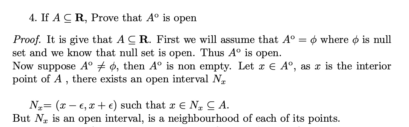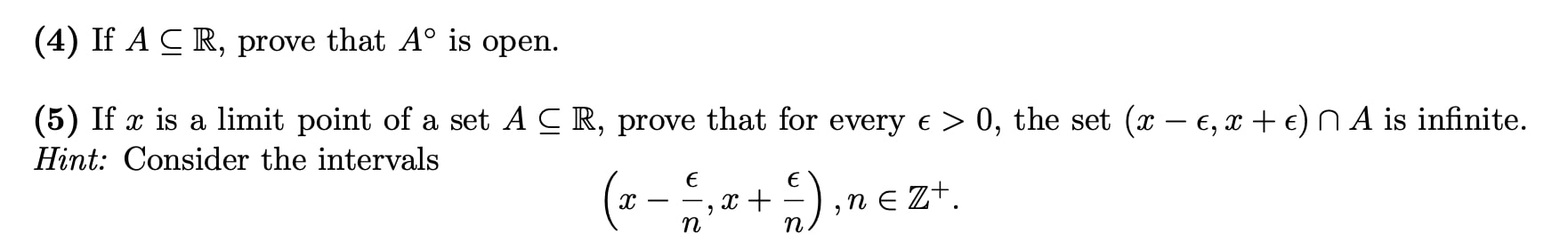 (4) If A C R, prove that A° is open. (5) If x is a limit point ...