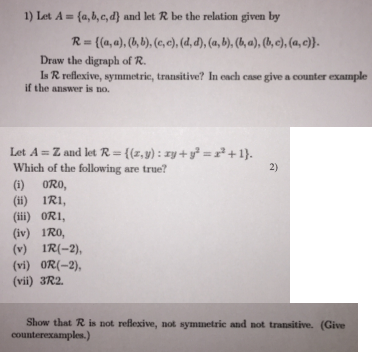 1) Let A = {a,b,c,d} and let R be the relation given by R = {{a,a)...