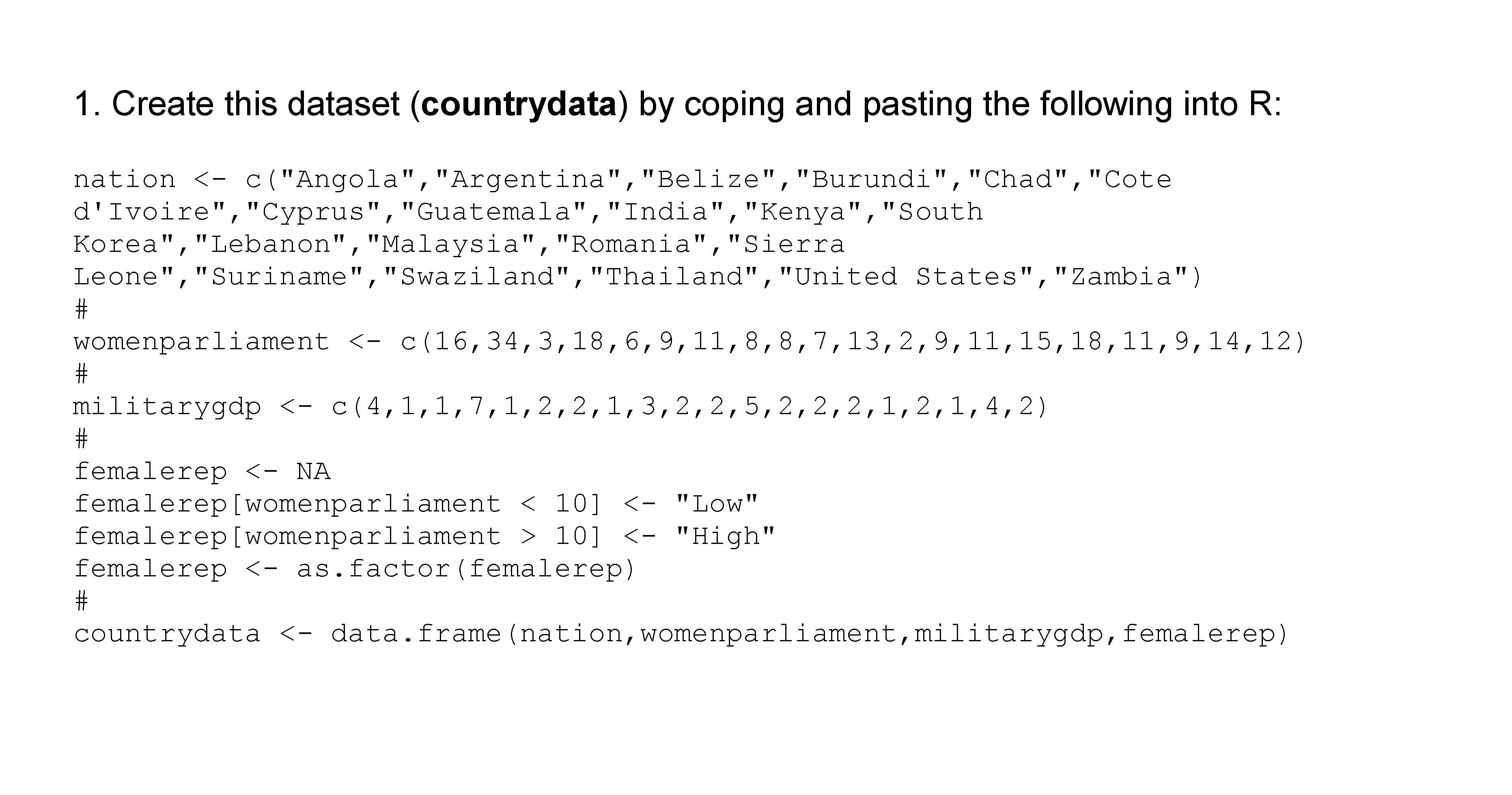 1. Create this dataset (countrydata) by coping and pasting the foll...