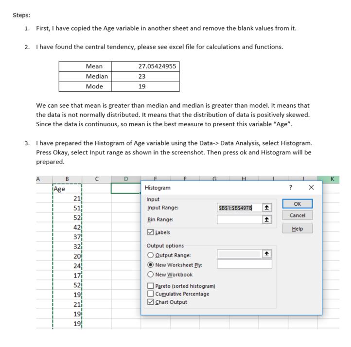 Choosing variable "age" find central tendency and explain...