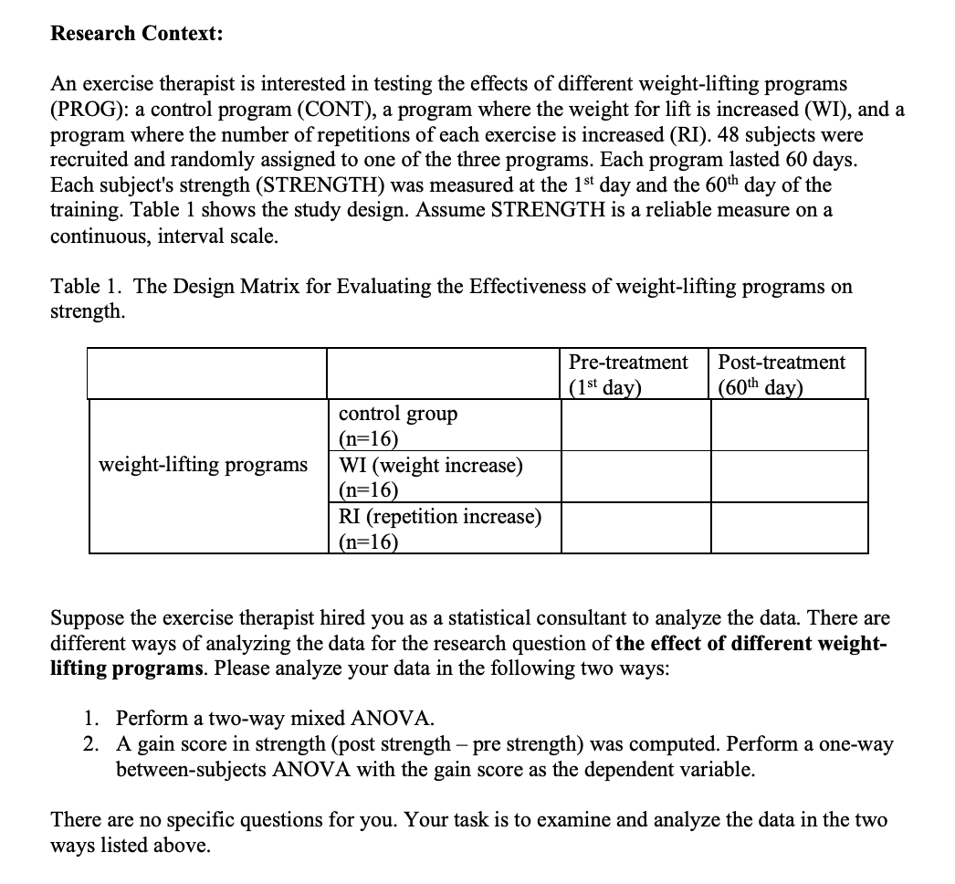 Research Context: An exercise therapist is interested in testing t...