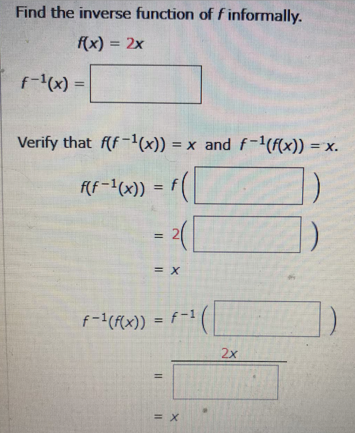 Find the inverse function of informally. f(x) = 2x f-1(x) = Veri...