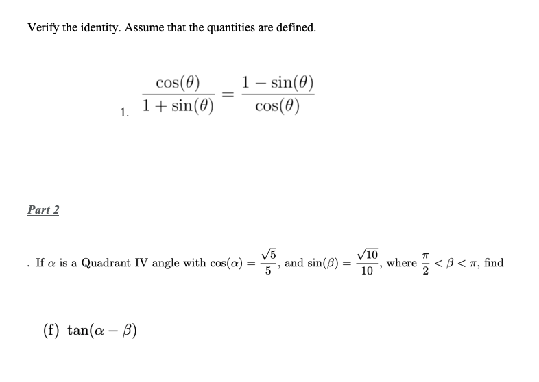 Verify the identity. Assume that the quantities are defined. cos(0...